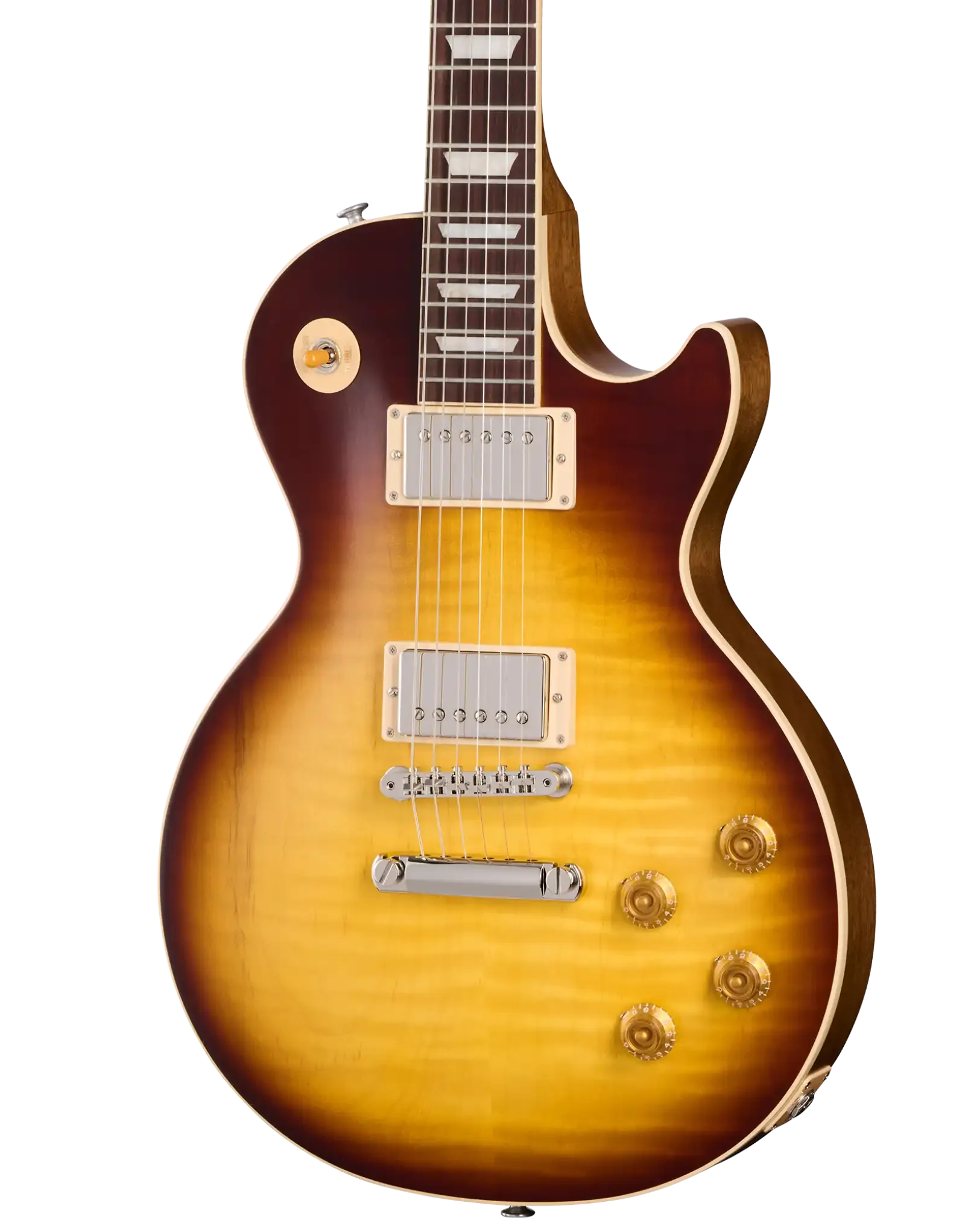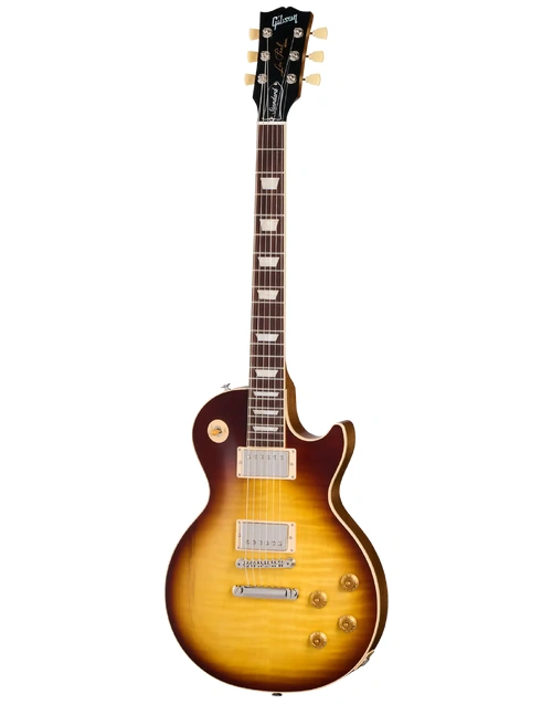 The Gibson Les Paul Standard 50s Faded in Vintage Tobacco Burst brings back the iconic design that shaped music across generations. Featuring a non-weight relieved mahogany body with an AA figured maple top, this guitar offers a warm, resonant tone with an extra bite. The 50s Vintage-profile mahogany neck ensures a solid and comfortable feel, while the satin nitrocellulose lacquer finish gives it an aged, classic look and smooth playability. The rosewood fretboard with 22 medium jumbo frets and acrylic trapezoid inlays adds to the overall comfort, making upper fret bends and chording effortless. Equipped with Burstbucker 1 and 2 pickups, hand-wired with Orange Drop capacitors, this Les Paul delivers vintage-style tones with exceptional clarity and sustain. A hardshell case is included to keep the guitar safe during travel.