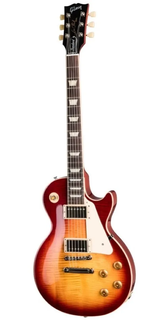 The new Les Paul Standard returns to the classic design that made it relevant, played and loved -- shaping sound across generations and genres of music. It pays tribute to Gibson's Golden Era of innovation and brings authenticity back to life. The Les Paul Standard 50's has a solid mahogany body with a maple top, a rounded 50's-style mahogany neck with a rosewood fingerboard and trapezoid inlays. It's equipped with an ABR-1, the classic-style Tune-O-Matic bridge, aluminum stop bar tailpiece, vintage deluxe tuners with keystone buttons, and aged gold tophat knobs. The calibrated Burstbucker 1 (neck) and Burstbucker 2 (bridge) pickups are loaded with AlNiCo II magnets, audio taper potentiometers and orange drop capacitors.