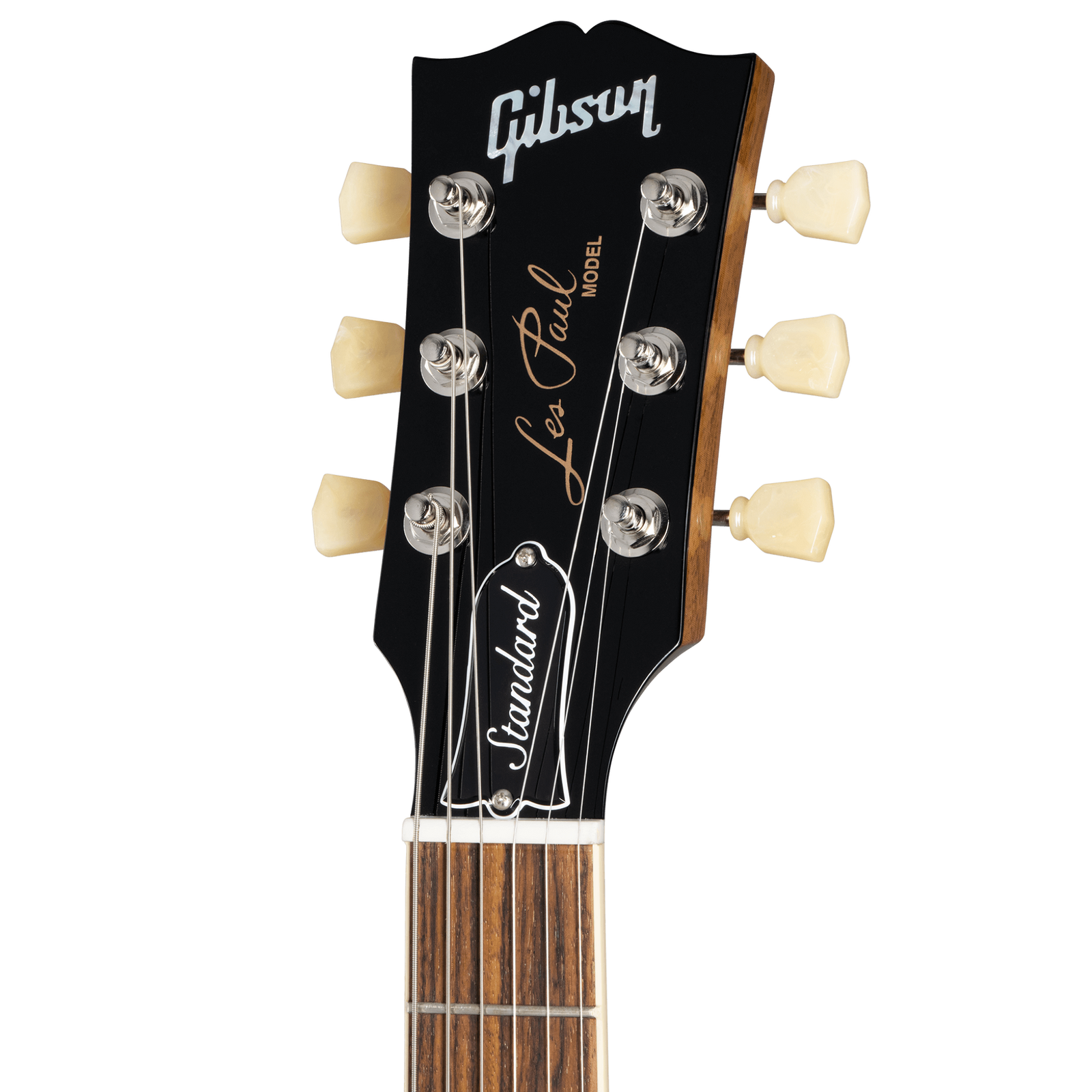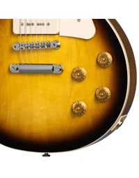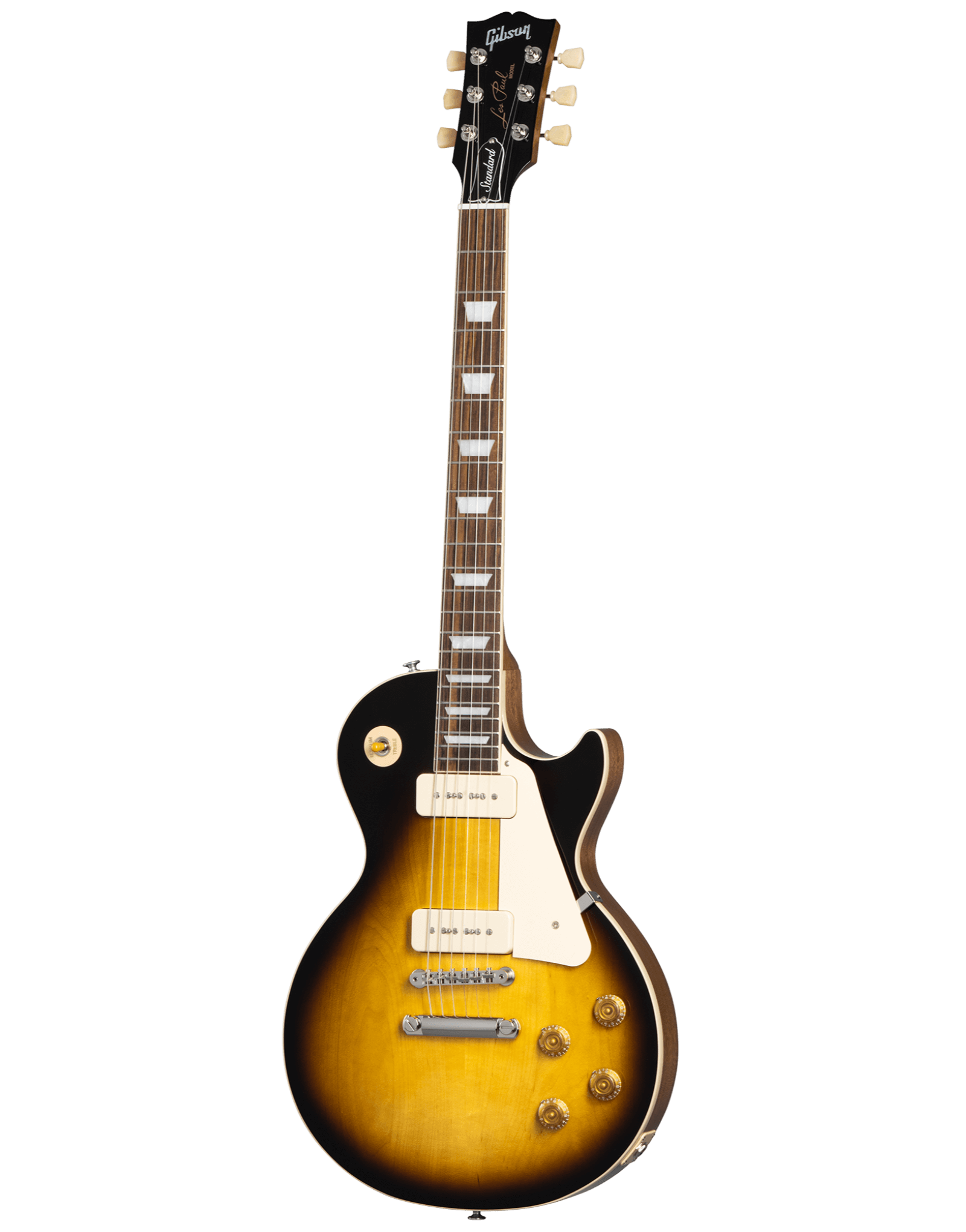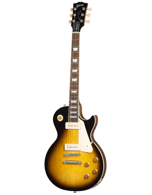 The new Les Paul Standard returns to the classic design that made it famous. It pays tribute to Gibson's Golden Era of innovation and brings authenticity back to life. The Les Paul Standard '50s P90 has a solid mahogany body with maple top and a rounded 50's-style mahogany neck with a rosewood fingerboard and trapezoid inlays. It's equipped with an ABR-1, the classic-style Tune-O-Matic bridge, aluminum stop bar tailpiece, vintage deluxe tuners with keystone buttons, and amber top hat knobs. The classic P-90 pickups (neck and bridge) are loaded with AlNiCo V magnets, audio taper potentiometers and orange drop capacitors.