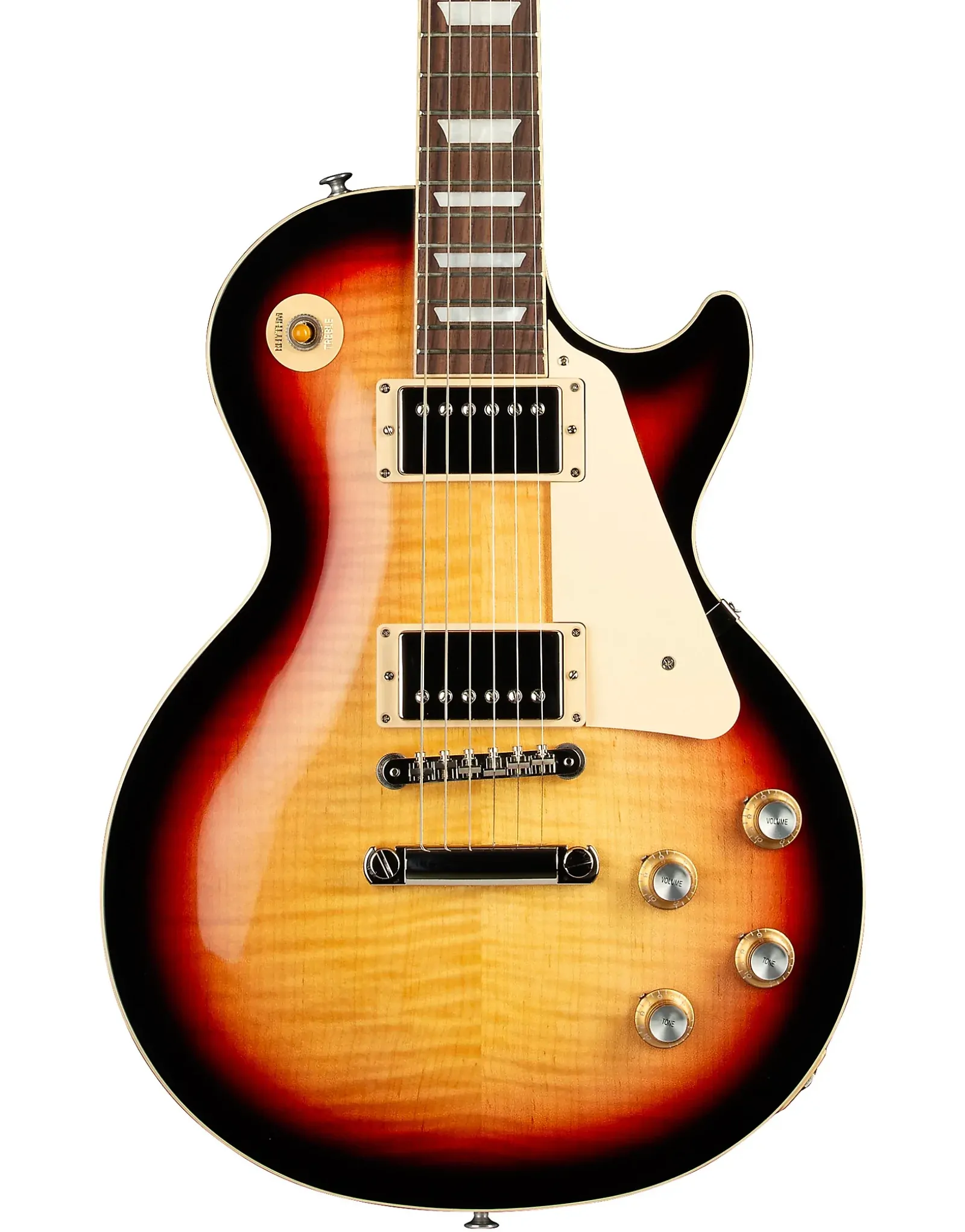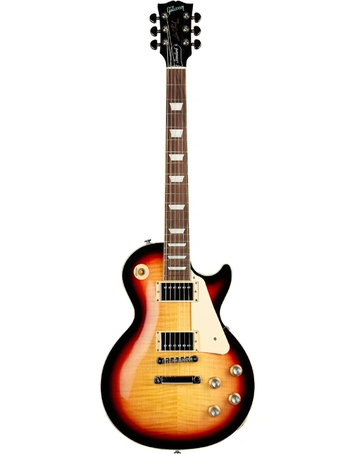 The new Les Paul Standard returns to the classic design that made it relevant, played and loved - shaping sound across generations and genres of music. It pays tribute to Gibson's Golden Era of innovation and brings authenticity back to life. The Les Paul Standard 60's has a solid mahogany body with an AA figured maple top, and a slim taper 60's-style mahogany neck with a rosewood fingerboard and trapezoid inlays. It's equipped with a classic-style Tune-O-Matic bridge, aluminum stop bar tailpiece, Grover Rotomatic "Kidney" tuners, and gold top hat knobs with silver reflectors. A pair of 60's Burstbucker humbucking pickups are loaded with AlNiCo V magnets, audio taper potentiometers and orange drop capacitors.