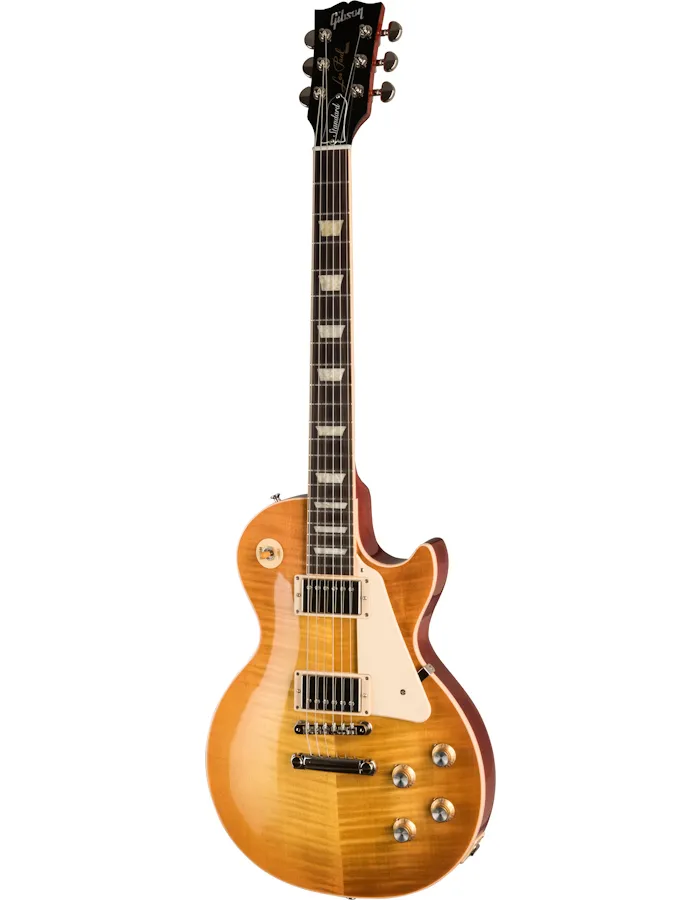The new Les Paul Standard returns to the classic design that made it relevant, played and loved - shaping sound across generations and genres of music. It pays tribute to Gibson's Golden Era of innovation and brings authenticity back to life. The Les Paul Standard 60's has a solid mahogany body with an AA figured maple top, and a slim taper 60's-style mahogany neck with a rosewood fingerboard and trapezoid inlays. It's equipped with a classic-style Tune-O-Matic bridge, aluminum stop bar tailpiece, Grover Rotomatic "Kidney" tuners, and gold top hat knobs with silver reflectors. A pair of 60's Burstbucker humbucking pickups are loaded with AlNiCo V magnets, audio taper potentiometers and orange drop capacitors.