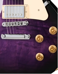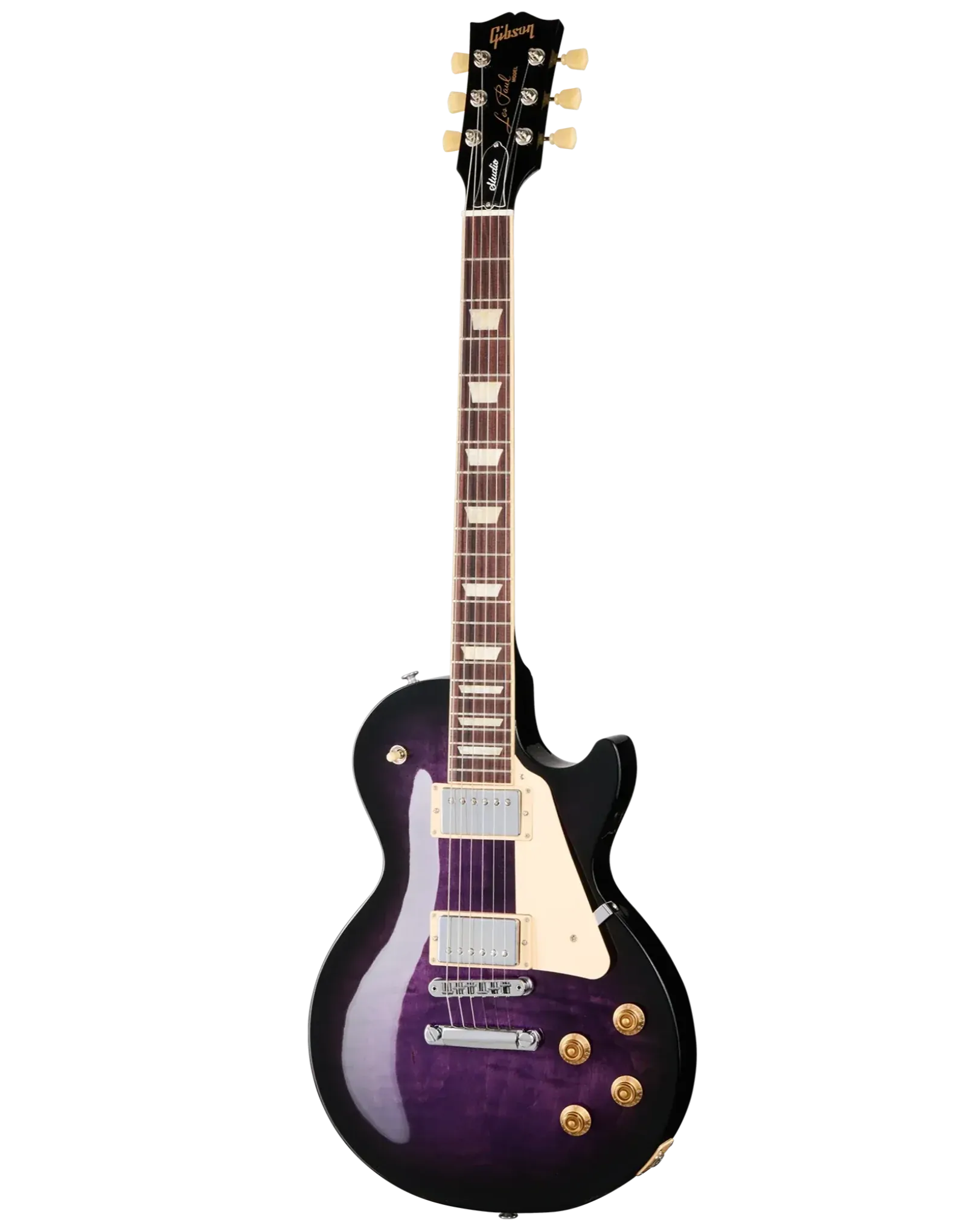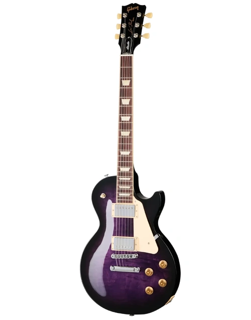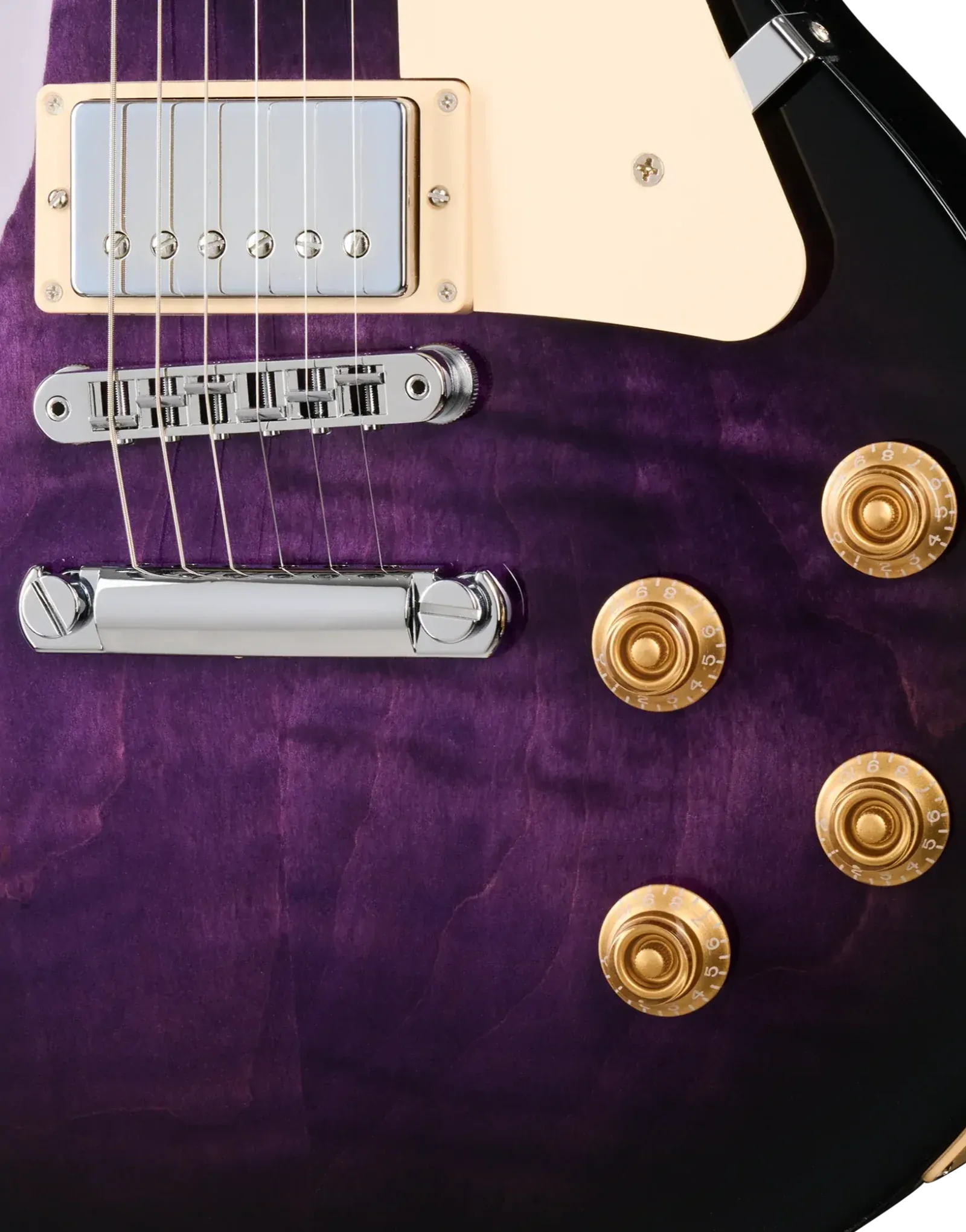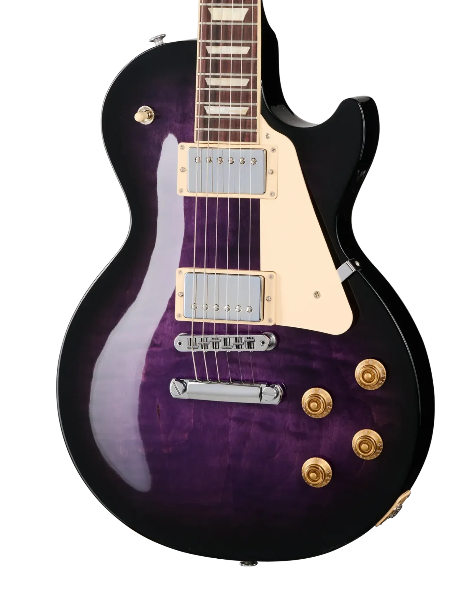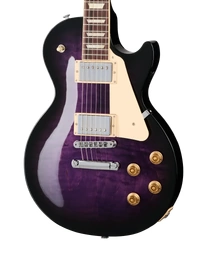 The Gibson Les Paul Studio Hand-Picked Figured Dark Purple Burst is a modern take on a classic. Featuring an AA figured maple top over a mahogany body with Ultra-Modern weight relief, it delivers that iconic Les Paul sound with greater comfort and playability. The SlimTaper mahogany neck and bound Indian rosewood fingerboard with acrylic trapezoid inlays make for a smooth, fast playing experience, while the 12" radius ensures effortless bends. A pair of Burstbucker Pro pickups, wired with coil-tap push/pull volume controls, offer huge tonal flexibility – from classic humbucker punch to single-coil sparkle. Hardware includes a Nashville Tune-O-Matic bridge, stop bar tailpiece, and Vintage Deluxe tuners for rock-solid tuning stability. Finished in a stunning Dark Purple Burst nitro lacquer, this Les Paul Studio is as striking visually as it is sonically. At Riffs & Licks Music, we think this guitar is perfect for players wanting premium looks, tone, and versatility without the Custom Shop price tag.