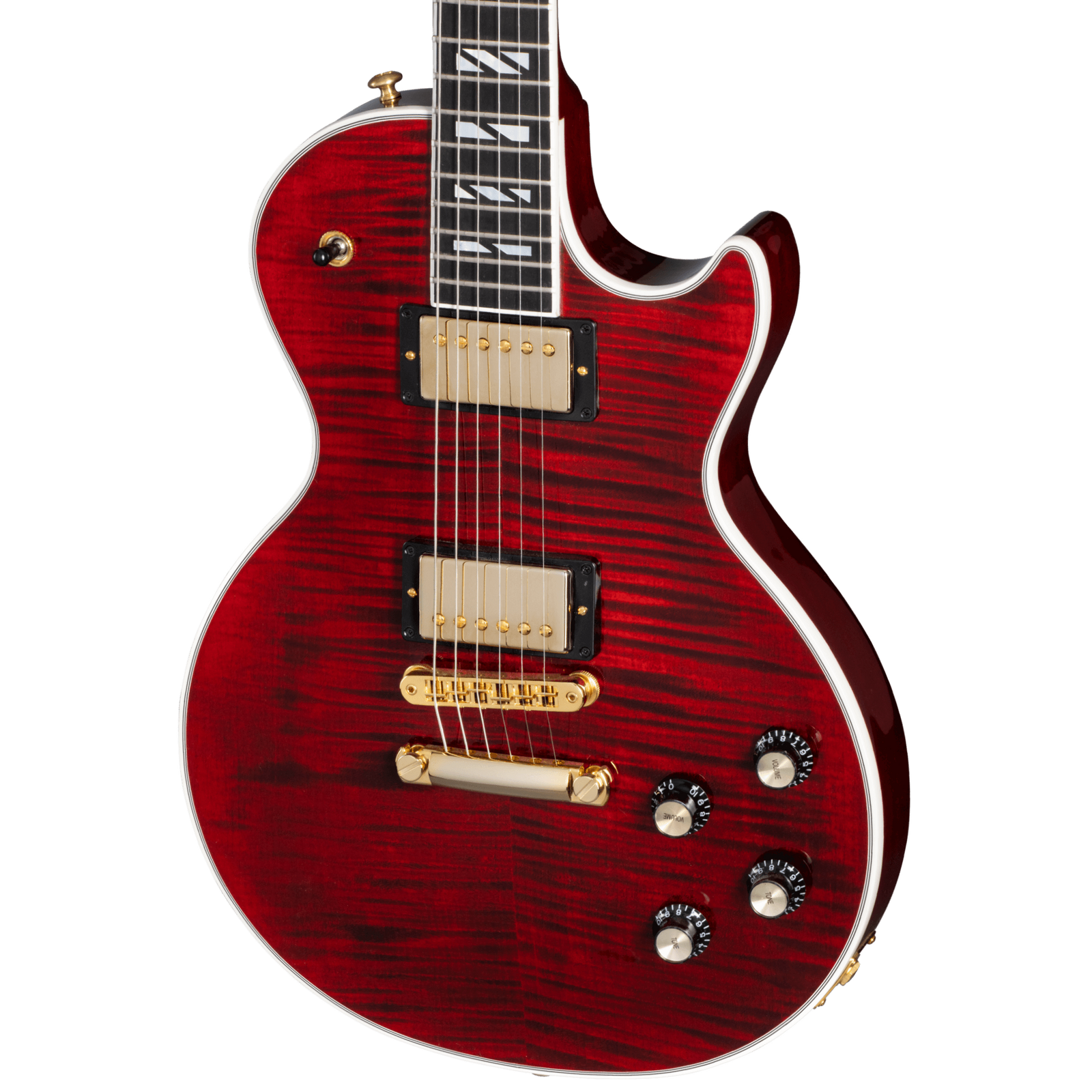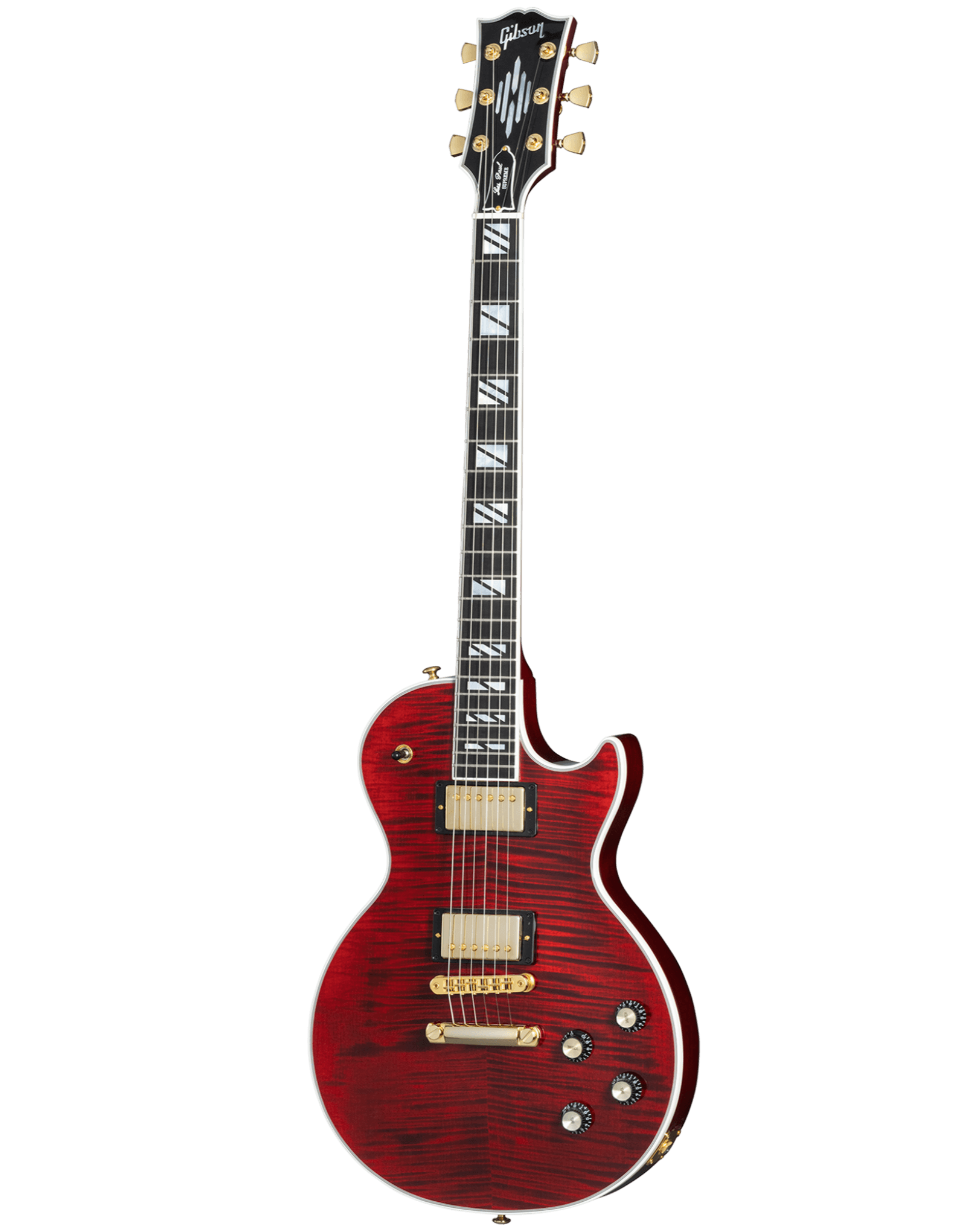 The Les Paul Supreme showcases a stunning AAA-figured maple top resting on a mahogany body with Ultra-Modern Weight Relief, ensuring a perfect balance of tonal richness and comfortable playability. The mahogany neck is graced with an ebony fretboard featuring a compound radius and Super Split Block mother-of-pearl inlays, providing both elegance and exceptional playability. To further enhance upper fret access, the neck boasts a Modern Contoured Heel.