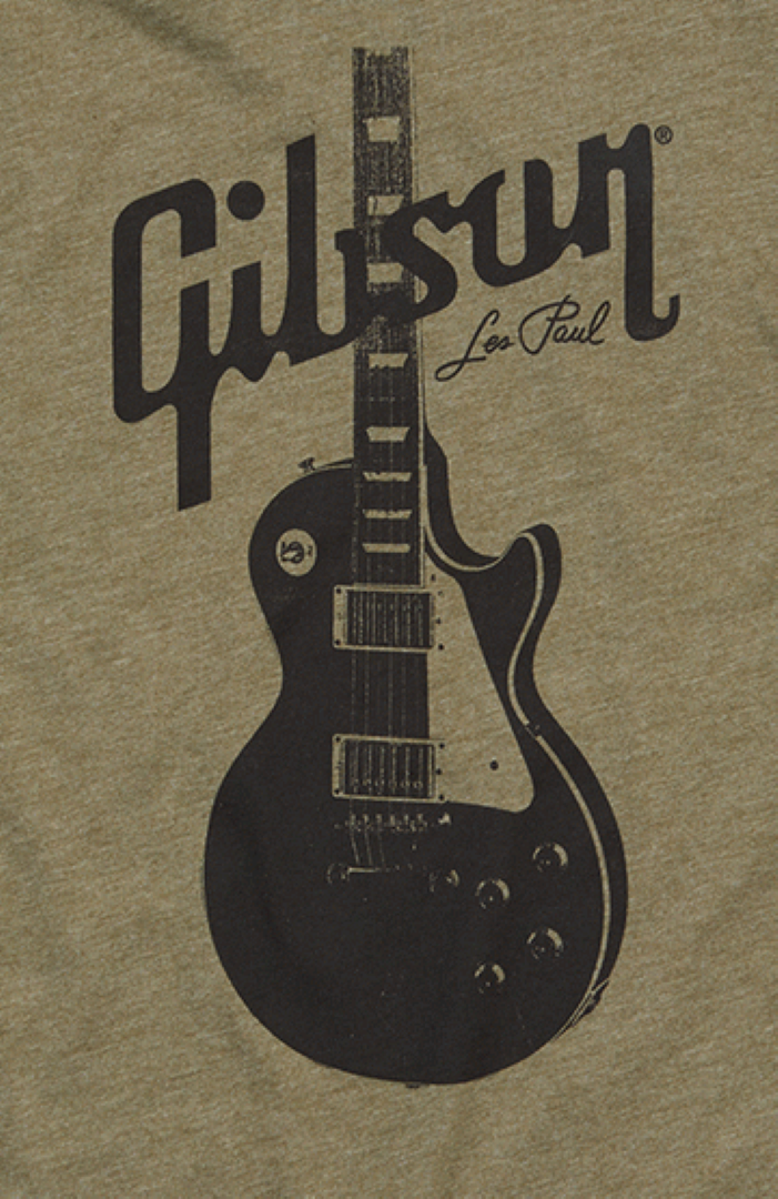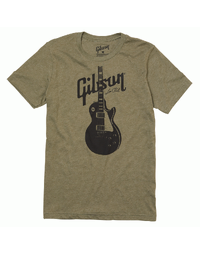 The Les Paul tee is a vintage green, and features the historic Les Paul model shape printed in black with a large Gibson logo printed across the chest.