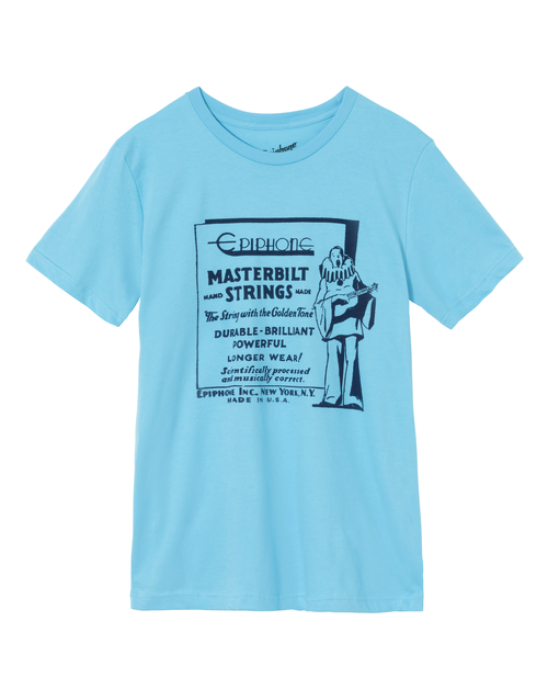 This comfortable Epiphone tee features artwork from Epiphone's Masterbilt Electar guitar string packaging dating back to the 1930s. Standard fit, unisex sizing. 100% Cotton. Machine wash cold with similar colours, tumble dry on low.