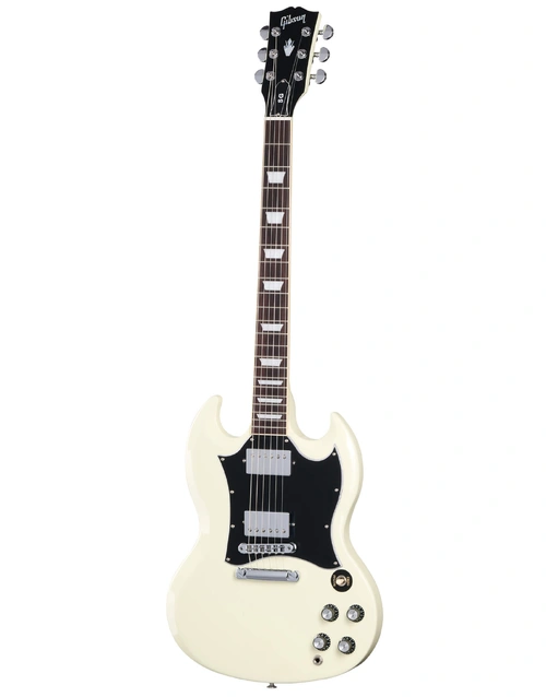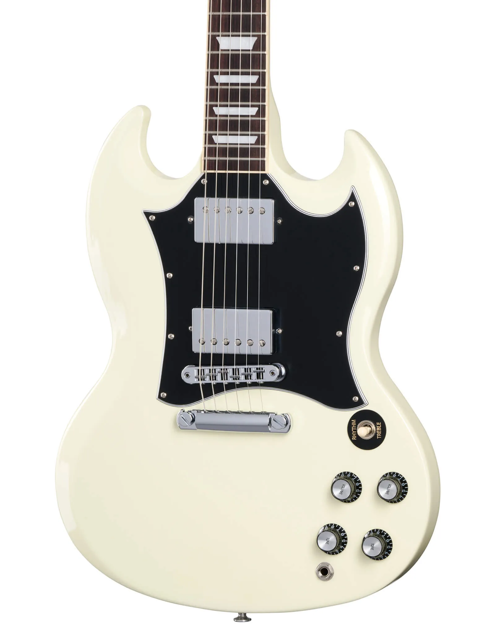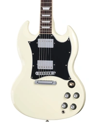 The Gibson SG Standard Custom Colours Edition in Classic White is a custom-coloured masterpiece, offering classic looks and features reminiscent of the late '60s SG models. Part of the Custom Colour Series, this SG Standard introduces vibrant new colour options to elevate your stage presence and guitar collection. Its rounded profile mahogany neck, bound rosewood fingerboard, and long tenon 19th fret neck joint ensure comfortable playability, while the solid mahogany body delivers exceptional sustain. Equipped with 490R and 490T Alnico 2 pickups, this SG Standard provides powerful, dynamic tones. Complete with a soft shell case, this SG Standard is perfectly tailored to your preferences.