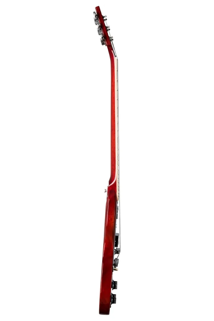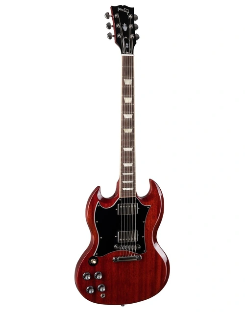 The Gibson SG Standard Heritage Cherry Left Handed rocks the classic looks and features associated with the late 60's style SG models sought after by many. A rounded profile mahogany neck, bound rosewood fingerboard, long tenon 19th fret neck joint, and a solid mahogany body provide the backbone for singing sustain. The 490R and 490T Alnico II pickups provide the power to drive. A black, 5-ply, full-face pickguard set this SG Standard apart from others... a truly versatile classic.
