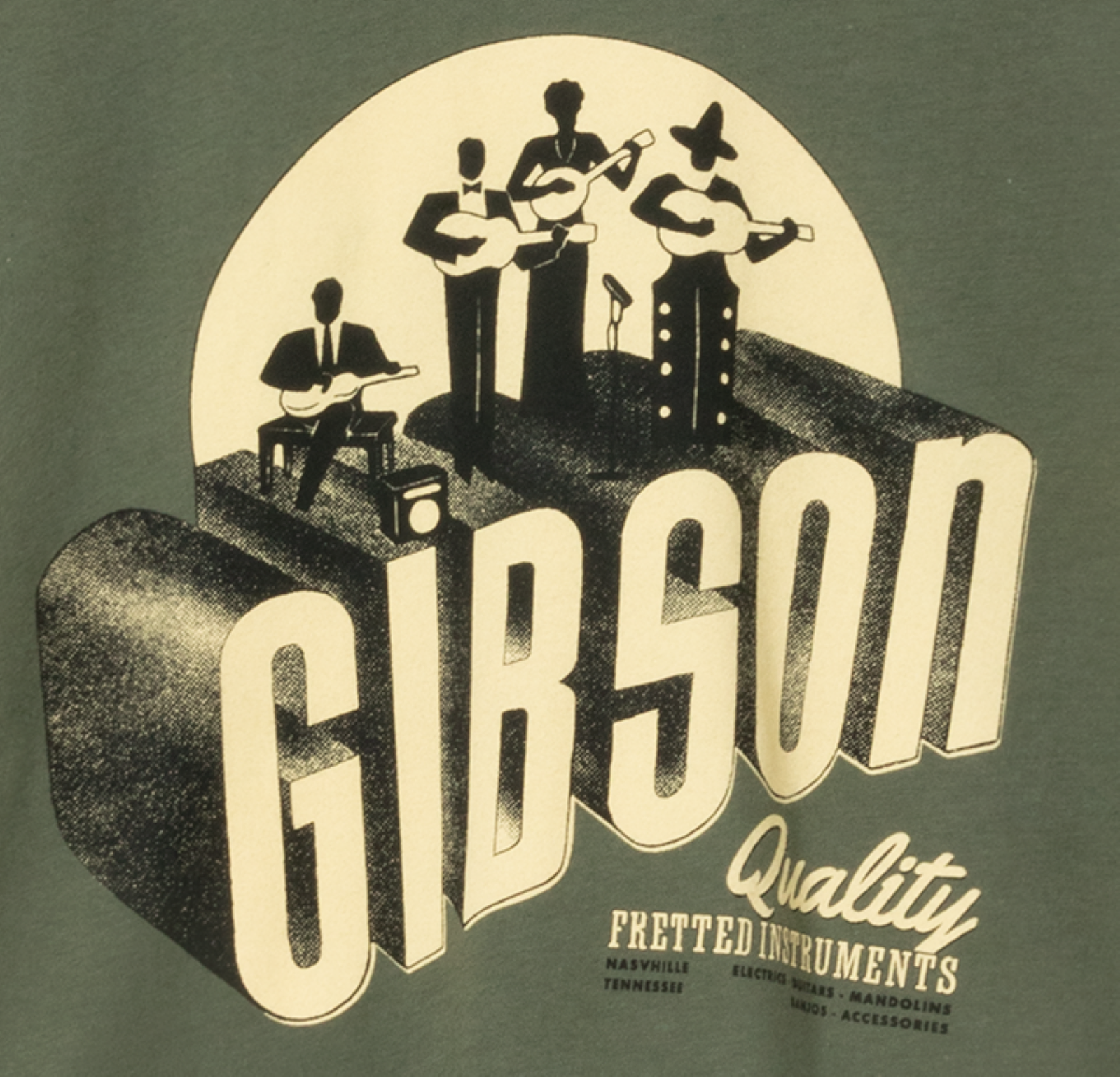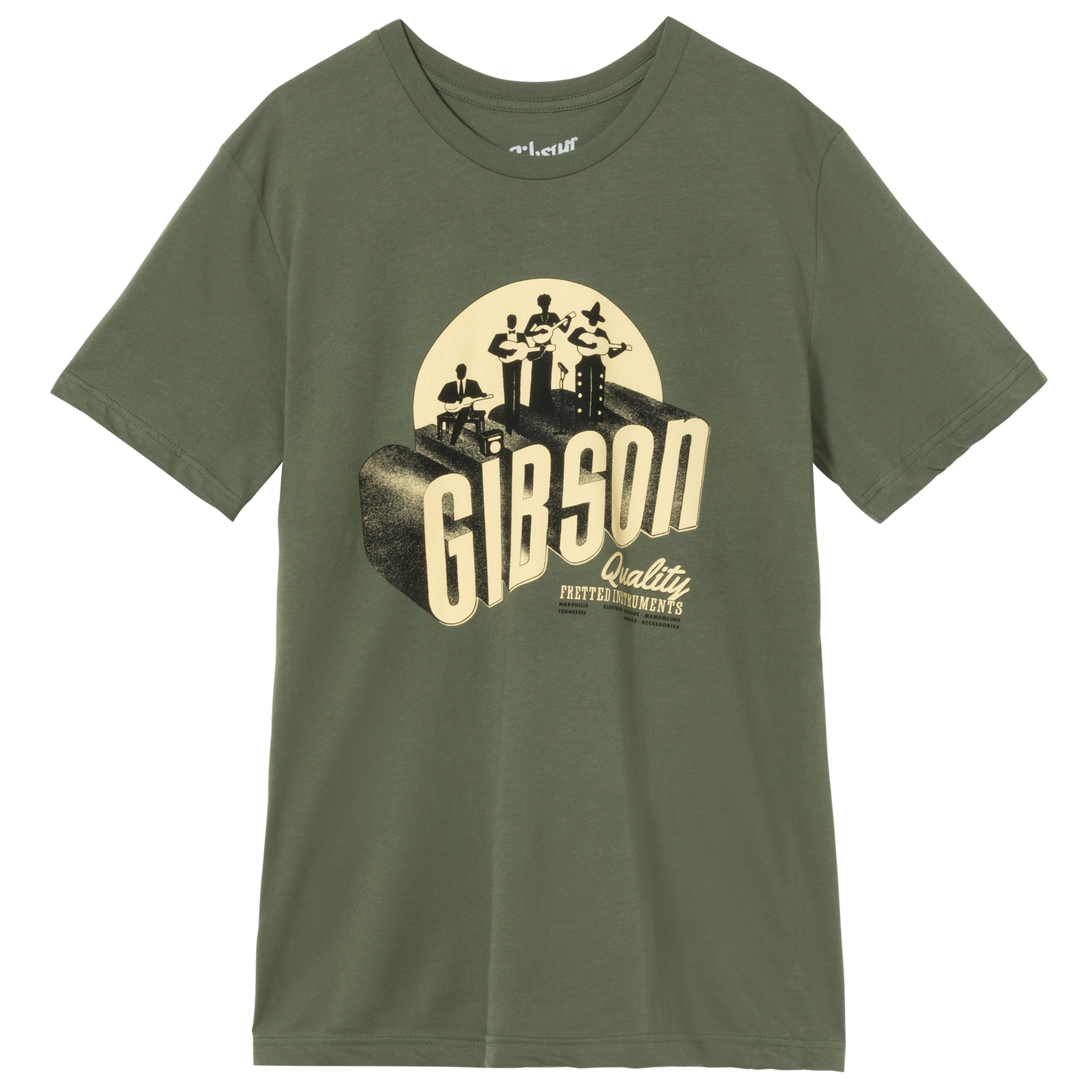 This comfortable green tee is adorned with artwork inspired by a Gibson product catalog cover from the 50s, which features a band on top, GIBSON in block letters, and the phrase QUALITY FRETTED INSTRUMENTS - Electrics, Guitars, Mandolins, Banjos, Accessories. Standard fit, unisex sizing. 100% Cotton. Machine wash cold with similar colors, tumble dry on low.