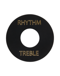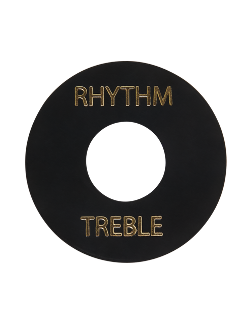 An exact replacement for worn out toggle switch washers, securely fitting over the switch shaft and held in place by the nut. This OEM part is made from ABS plastic and is black , with the goldimprinted letters "RHYTHM" and "TREBLE".