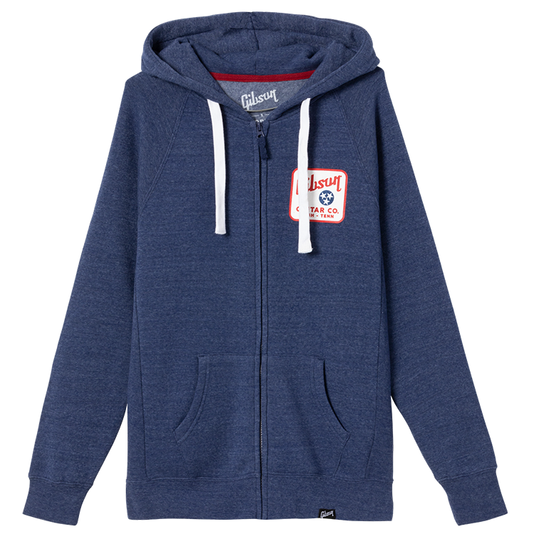 This warm and comfortable blue Tristar Fullzip hoodie features a Gibson logo, the Tri-Star emblem from the Tennessee state flag, and a shout-out to their home city of Nashville