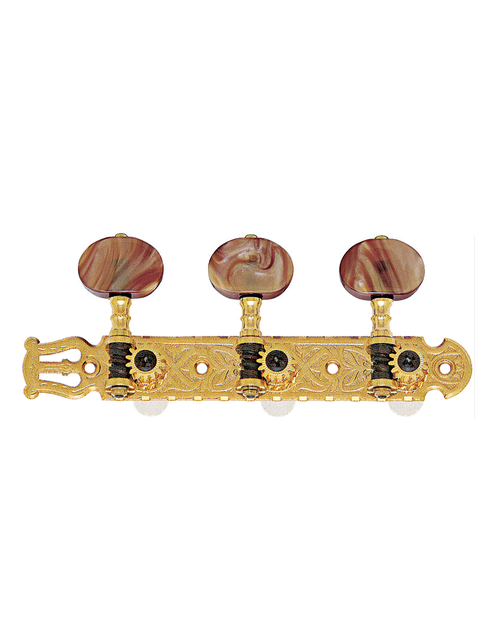 35mm high quality gold plated classic machine heads. Engraved plates. Rock-solid posts. Coffee swirl oval buttons. 30mm posts. 3-a-side. Packaged.