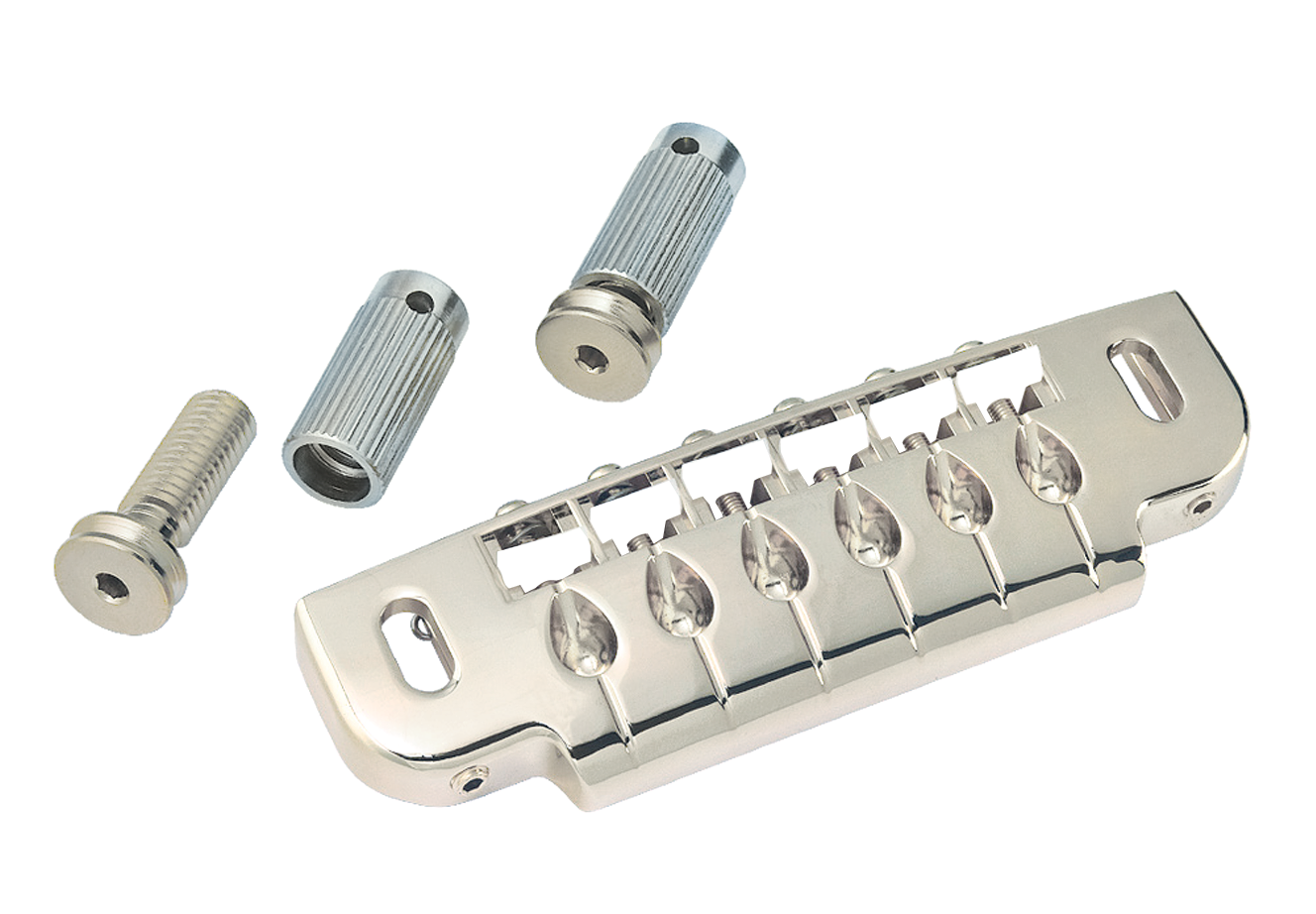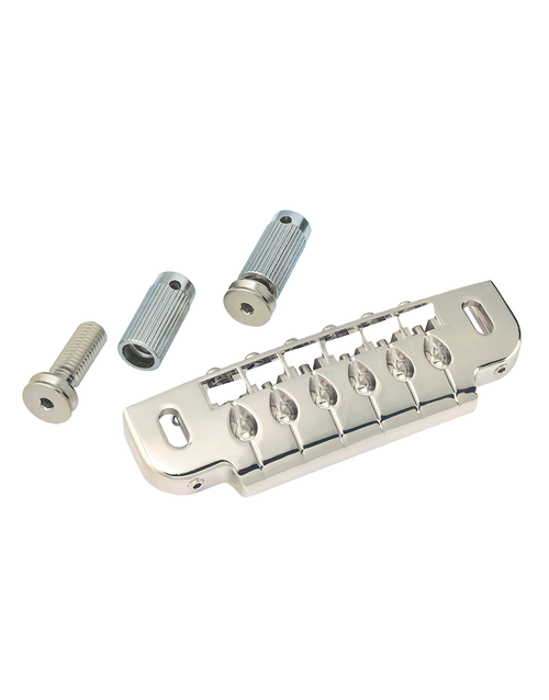 LP style wrap-over combined bridge/tail piece assembly. With patented stud lock. Individual height and intonation adjustment. Hard zinc saddles. String pitch 10.5mm. Chrome.