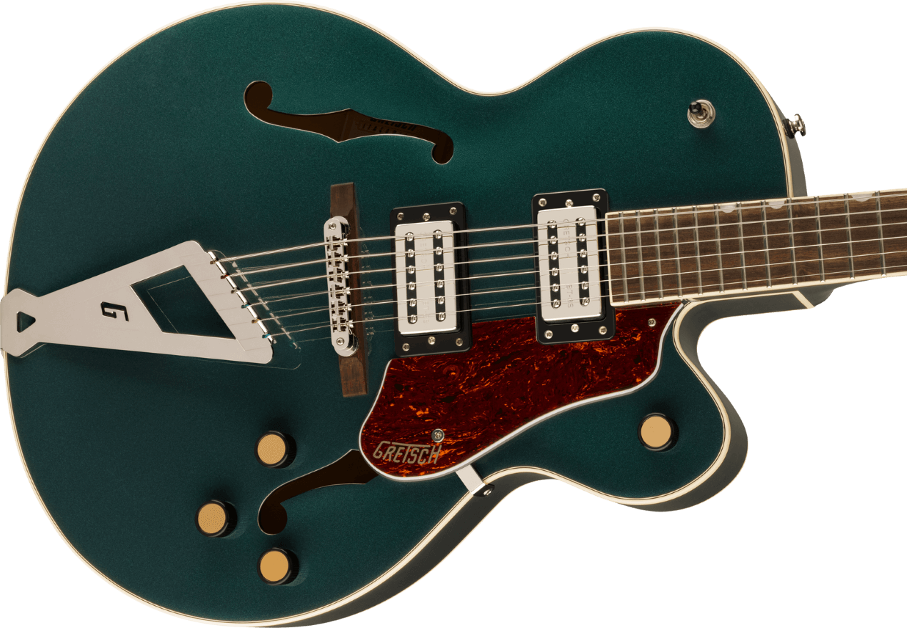 The G2420 Streamliner, finished in the iconic Cadillac Green, embodies authentic Gretsch style. Its fully hollow arched maple body, adorned with a three-ply tortoise pickguard, delivers rich fullness and deep resonance, creating the coveted "big-body sound" that's perfect for a wide range of musical styles. This guitar is equipped with the revolutionary Broad'Tron BT-3S humbucking pickups. These pickups, featuring a blend of Alnico 5 and Alnico 2 magnets, provide you with stronger mids, tight yet full lows, and smooth clear highs. Your tones will be rich, dynamic, and musically expressive.