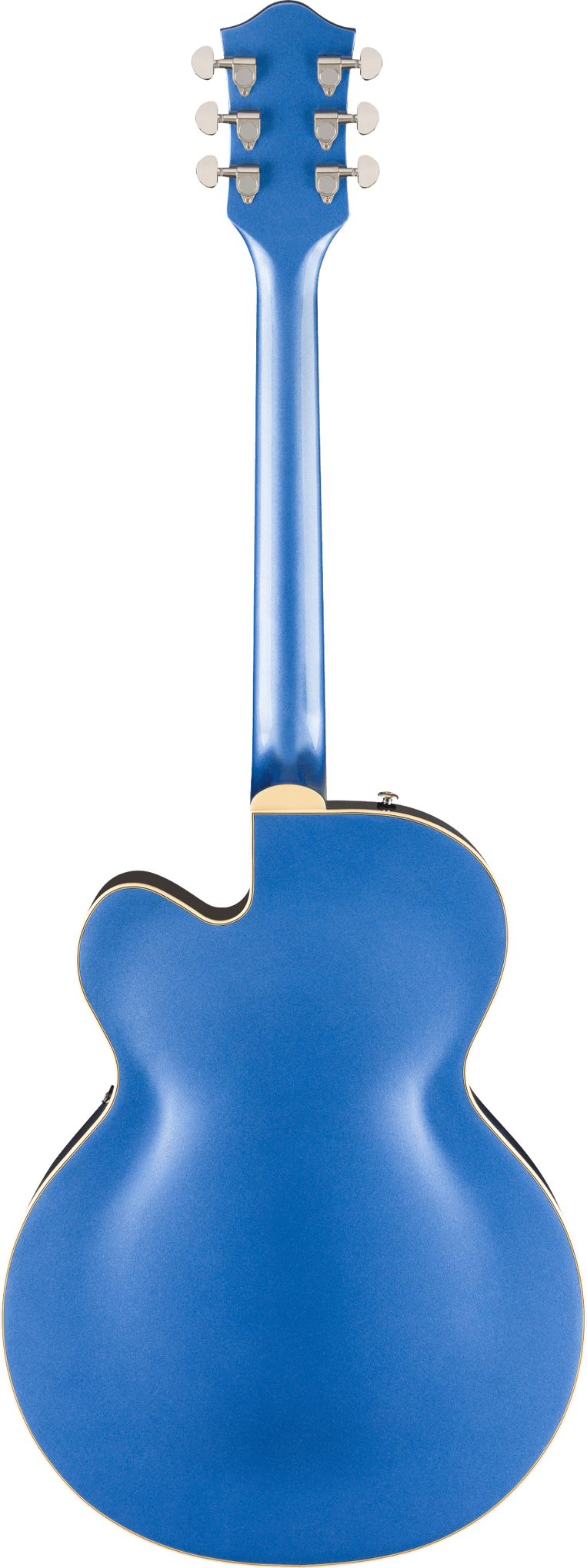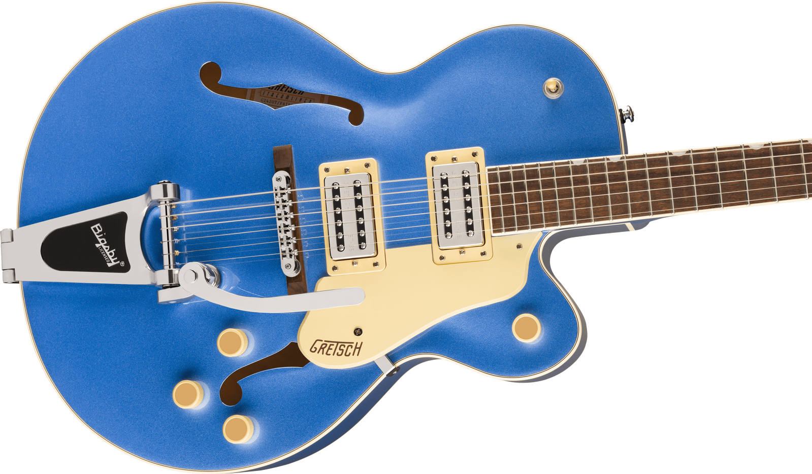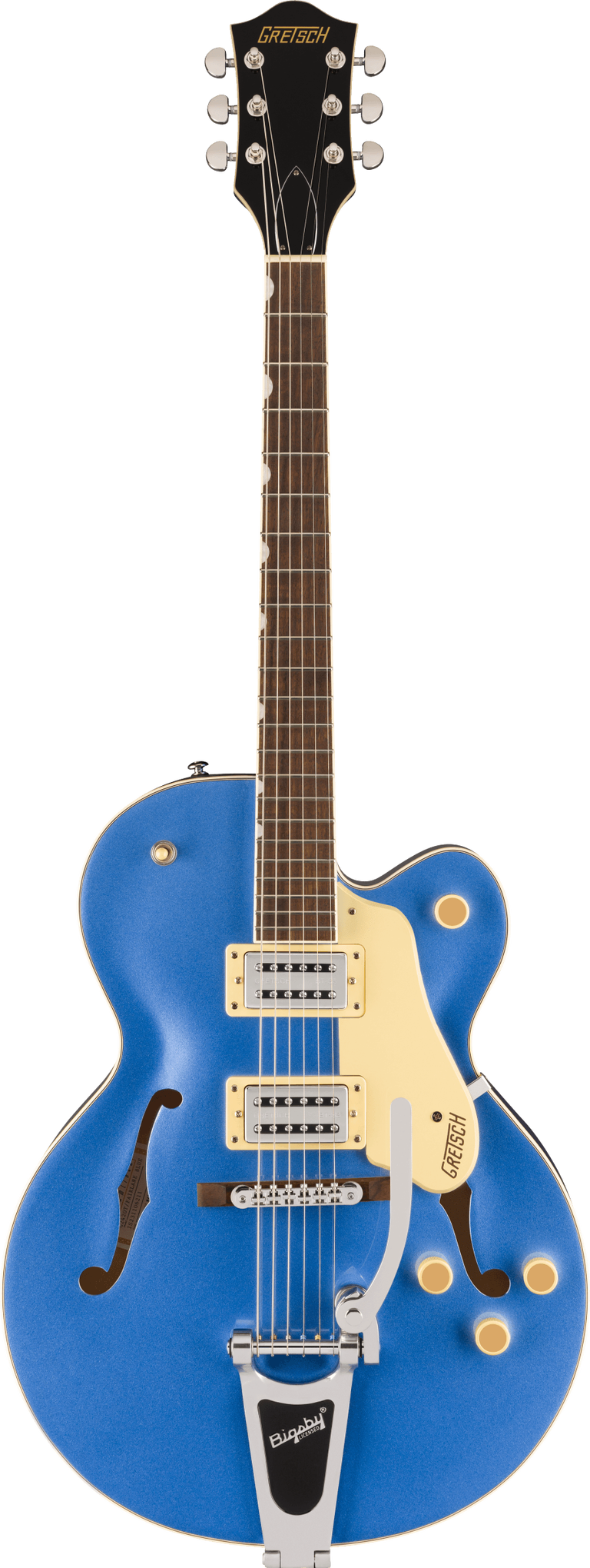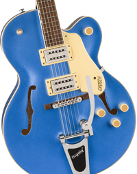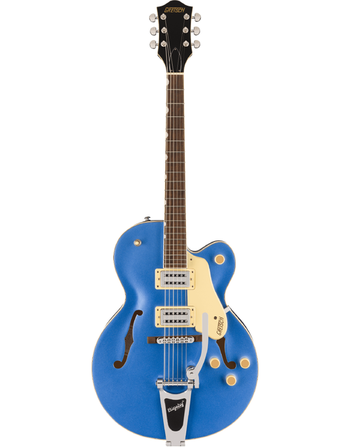 The Gretsch G2420T Streamliner in Fairlane Blue delivers that unmistakable hollow body resonance with a more versatile, modern edge. The fully hollow laminated maple body produces a rich, open tone with plenty of depth and air, making it ideal for everything from clean rhythm work to driven, expressive lead playing.