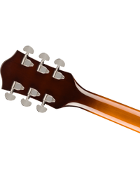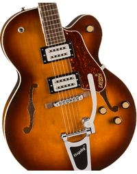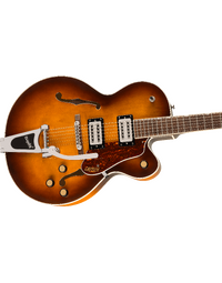 The Gretsch G2420T Streamliner Hollow Body with Bigsby in Robusto Burst blends vintage charm with modern versatility. Built with a fully hollow laminated maple body and set nato neck, this guitar delivers deep resonance and rich, full-bodied tone. The newly designed Broad'Tron BT-3S pickups provide bold articulation with push/pull coil-splitting for added tonal flexibility. An Adjusto-Matic bridge with secured laurel base and Bigsby B60 vibrato tailpiece give expressive control and stable tuning. Aged white binding, tortoiseshell pickguard and vintage-style radio knobs round out its classic appeal.