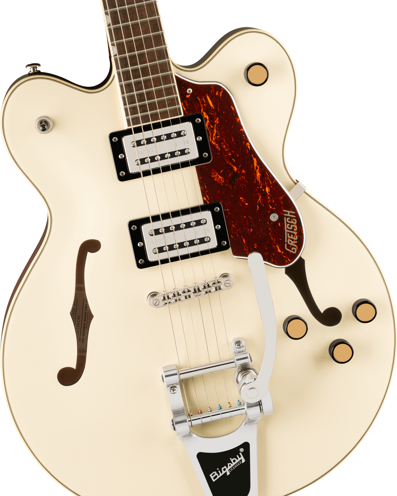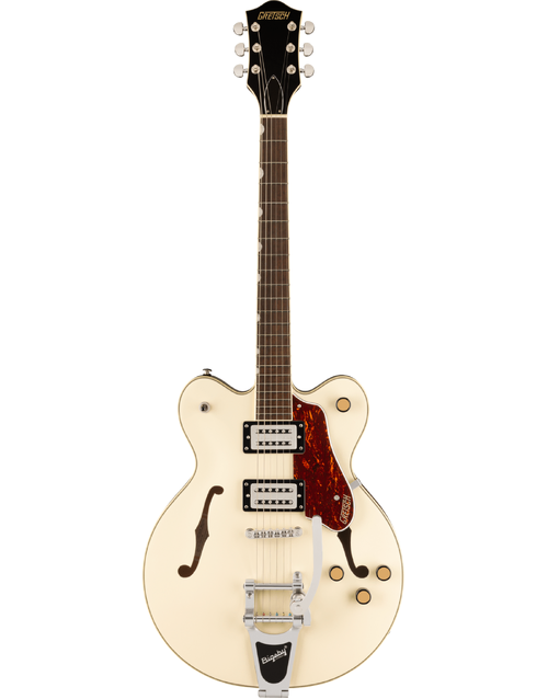 The Gretsch G2622T Streamliner Semi-Hollowbody Centre Block Double-Cut with Bigsby LRL Vintage White offers a dynamic blend of vintage charm and modern features. Designed for the player who demands more from their instrument, this guitar features the all-new Broad'Tron BT-3S humbucking pickups, delivering powerful sound with excellent clarity. The 16" double-cutaway arched maple body with a chambered centre block enhances sustain and reduces feedback, while the Bigsby B70 vibrato tailpiece adds a classic touch of tremolo action. The soft "C"-shaped nato neck provides comfort and control, and the 12"-radius laurel fingerboard with pearloid Neo Classic thumbnail inlays ensures smooth playability. With the master volume, master tone, individual pickup volume controls, and a push/pull coil-splitting feature, this guitar offers endless tonal possibilities. Finished in stunning Vintage White with nickel hardware and a tortoise pickguard, the G2622T is both a performance powerhouse and a visual standout.