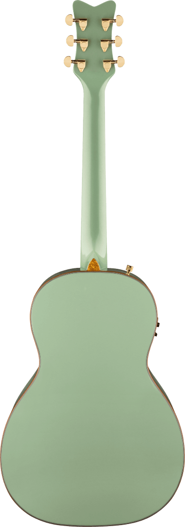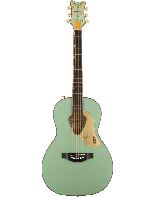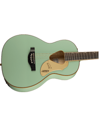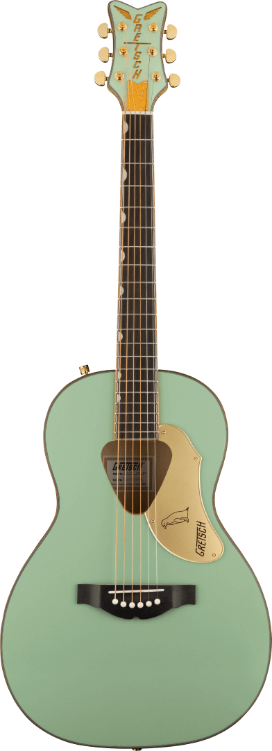 At Riffs & Licks Music, we think the Gretsch G5021E Rancher Penguin Parlor Acoustic Guitar w/Pickup, finished in Mint Metallic, is perfect for anyone who wants to turn heads with a big, bold tone and aesthetic.