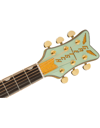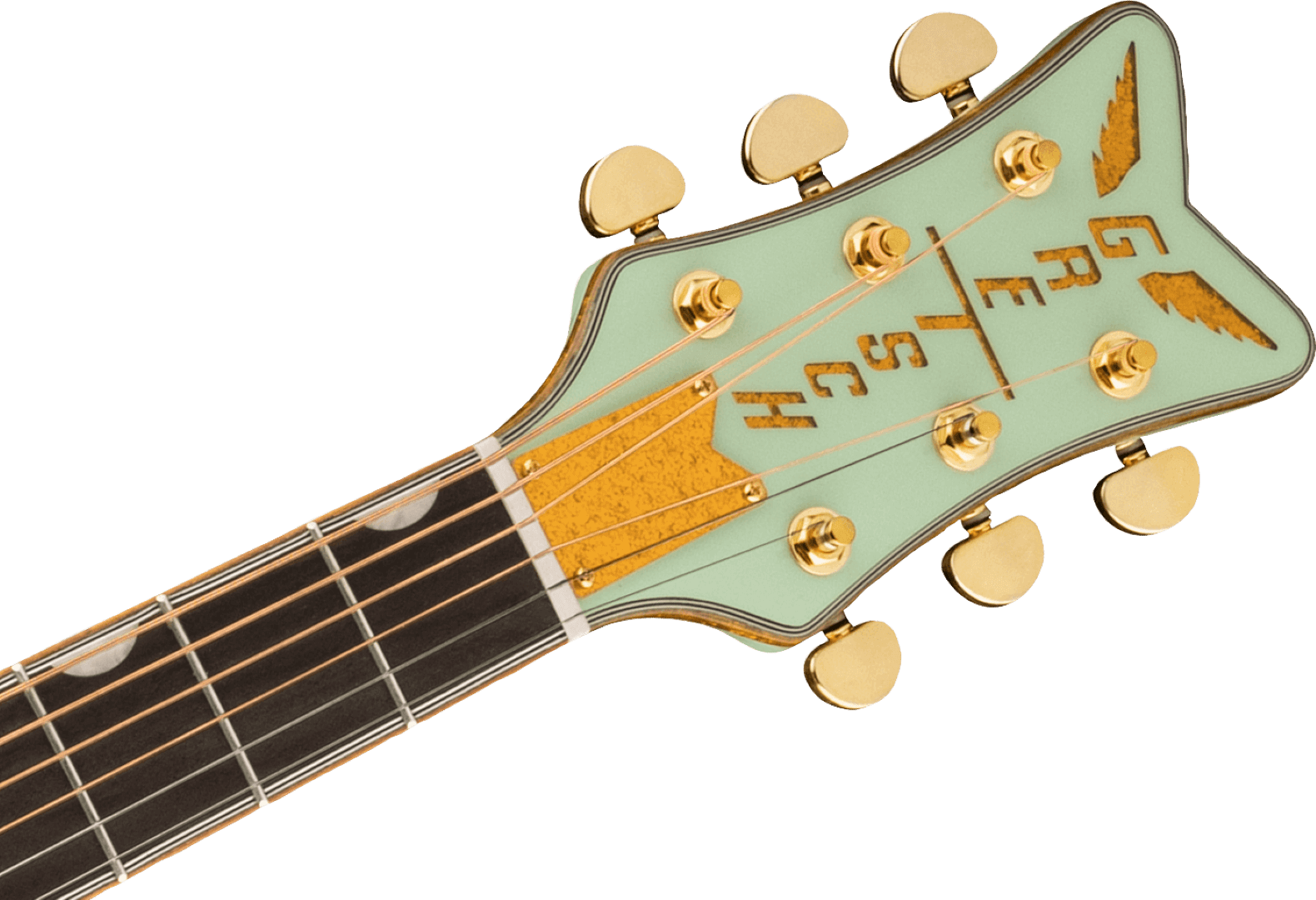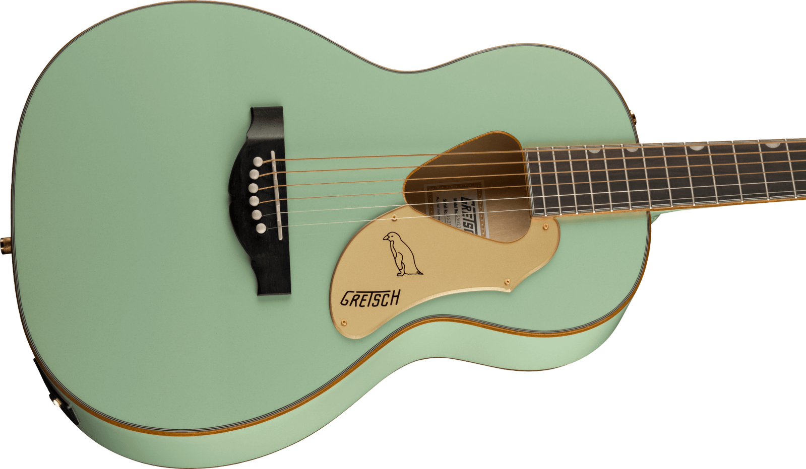 The Gretsch G5021E Rancher Penguin Parlor Acoustic/Electric Guitar boasts flashy gold hardware and a Mint Metallic finish that matches its rich and resonant tone. A Fishman PreSys III pickup and preamp ensure the tonal nuances of the Penguin Parlor's solid Spruce top, and Maple back and sides, are present when plugged into an amp or P.A. A U-shaped Mahogany neck and 12"-radius Laurel fingerboard with 20 vintage frets provide comfortable playability. The Penguin also features pearloid Neo-Classic thumbnail inlays, a synthetic bone nut, Laurel bridge, gold sparkle binding, and vertical wing Gretsch headstock logo, gold plexi pickguard, and gold hardware.