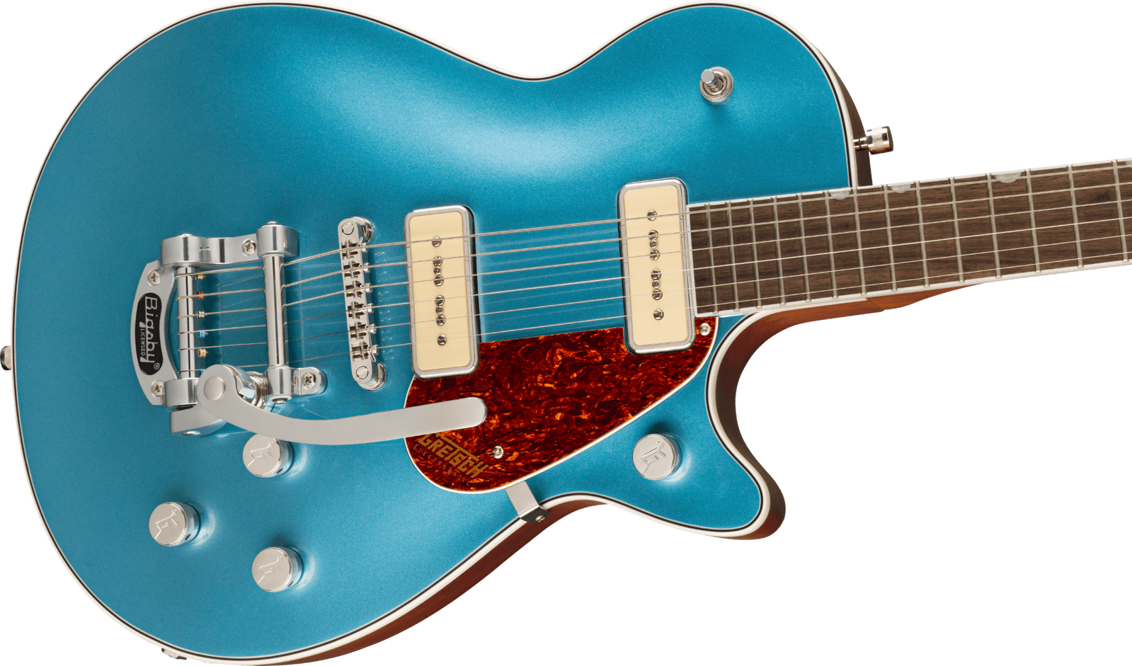 Introducing the Gretsch G5210T-P90 Electromatic Jet Two 90 Single-Cut w/ Bigsby LRL in Mako finish – a guitar that seamlessly blends vintage styling with modern performance. This stunning instrument is perfect for musicians who desire an uncompromising combination of classic Gretsch tone and style with modern playability and affordability.