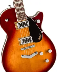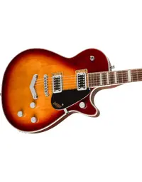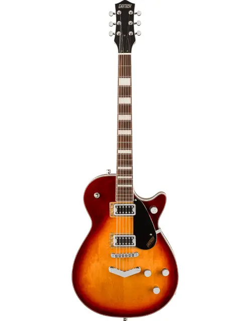 The Gretsch G5220 Electromatic Jet BT Single-Cut with V-Stoptail in Sweet Tea offers true Jet essence with powerful tonal versatility. Its chambered mahogany body with a maple top delivers a rich midrange with deep lows and sparkling highs, forming a balanced acoustic foundation. Equipped with dual Black Top Broad'Tron pickups, this guitar drives thick, aggressive overdrive while retaining definition and clarity for pristine clean tones. Intuitive controls include individual pickup volume knobs, a master tone, and a master volume with a treble bleed circuit for precise tonal shaping. Featuring a 12" radius laurel fingerboard, medium jumbo frets, and a lower-set mahogany neck, it ensures effortless playability. The Anchored Adjusto-Matic bridge, V-Stoptail, and vintage-inspired details like Big Block inlays and purfling complete its classic look and sound.