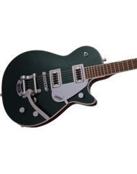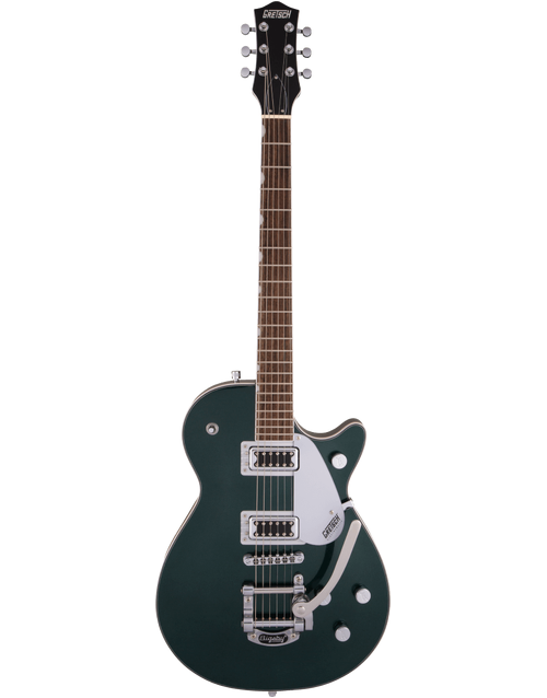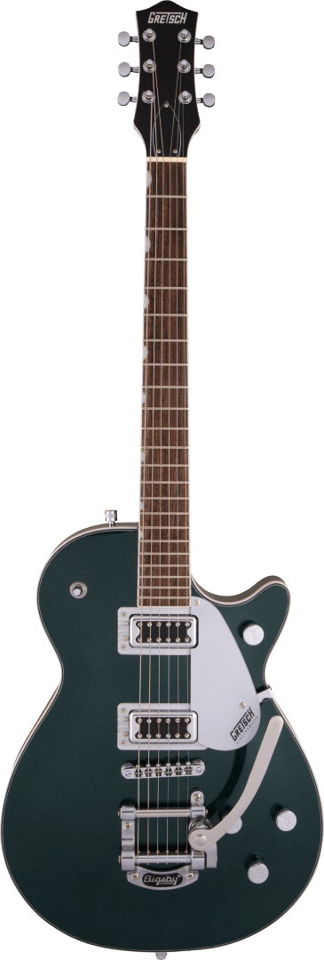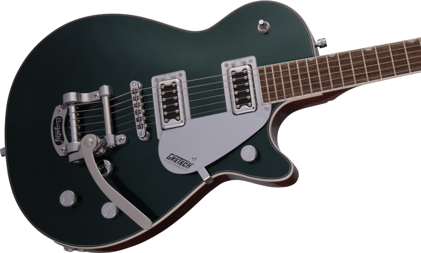 The Gretsch G5230T Electromatic Jet Single Cut Bigsby FT, finished in Cadillac Green, is a no-nonsense tone machine, with that great Gretsch sound. Featuring a chambered Mahogany body, paired with a Maple top, the G5230T produces resonant lows and mids, with a smooth high end, for a robust, balanced tone.