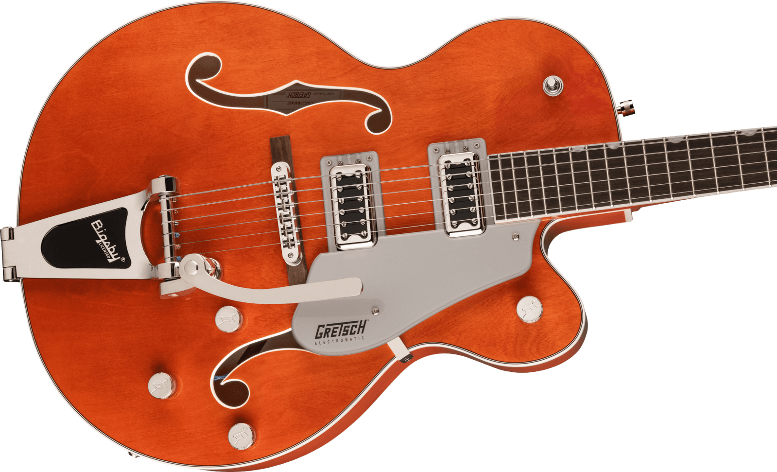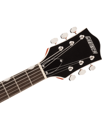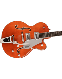 Other premium features include oversized bound "F" holes and aged multi-ply body binding, versatile upgraded controls including master volume treble bleed circuit, smaller late-'50s G6120 bound headstock, Graph Tech NuBone nut, pearloid Neo-Classic thumbnail fingerboard inlays and a Bigsby B60 vibrato tailpiece.