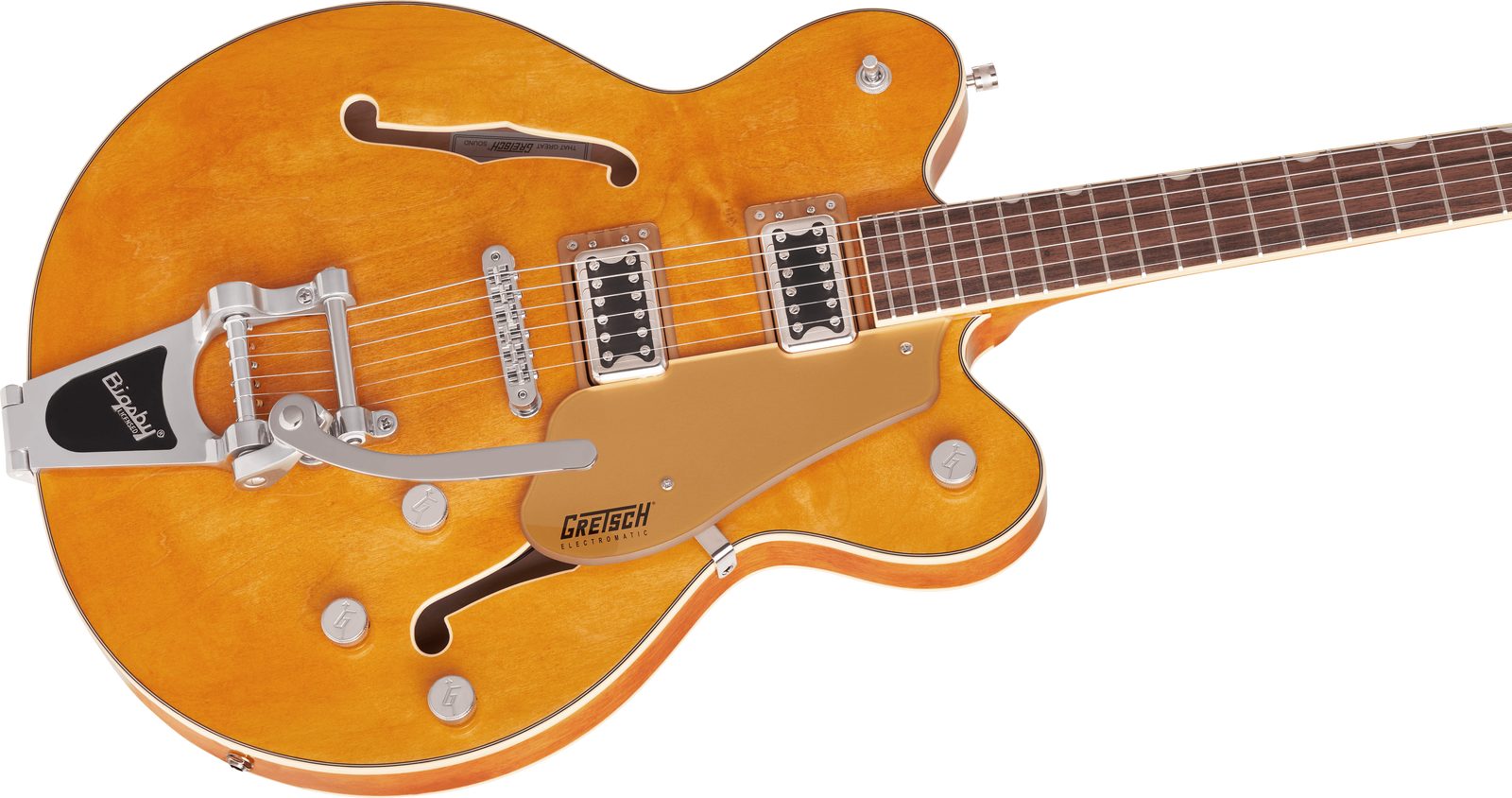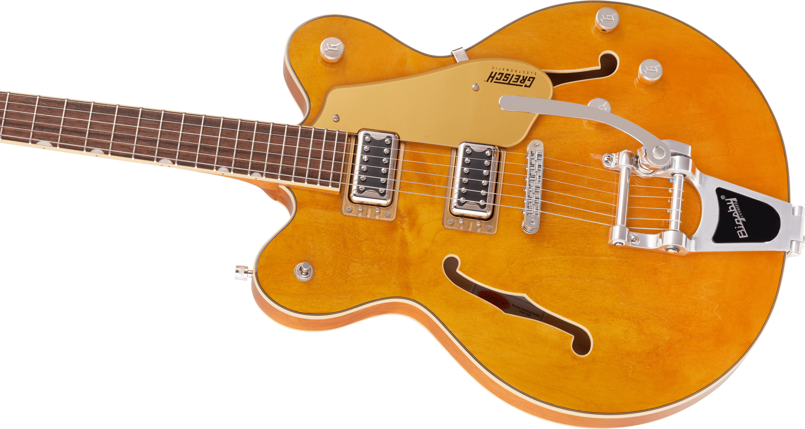 The Gretsch G5622T Electromatic Center Block Double-Cut with Bigsby, in Speyside, gives you that pure and powerful Gretsch sound, even at high volumes. This is thanks largely due to the chambered spruce centre block in its double-cutaway maple body - this combination gives players dynamic resonance, lightweight comfort, and high gain power. These tones woods are paired perfectly with two Black Top Broad'Tron humbuckers for that classic chiming, yet punchy, Gretsch tone.