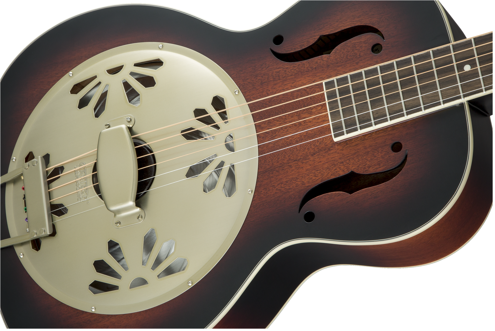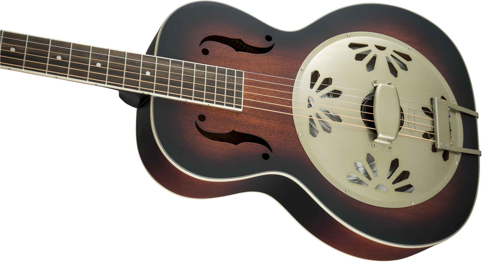 When you play chunk rhythm, finger-style, bottleneck or anything else, the all-mahogany deluxe-appointed G9241 Alligator Biscuit Roundneck resonator guitar projects its distinctively swampy tones all the way to the back door of any dance hall.