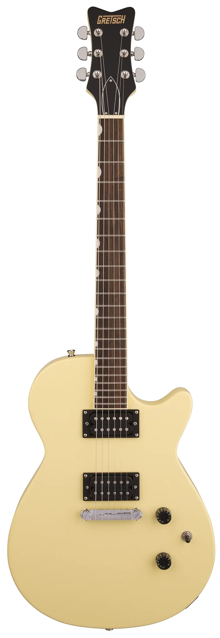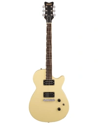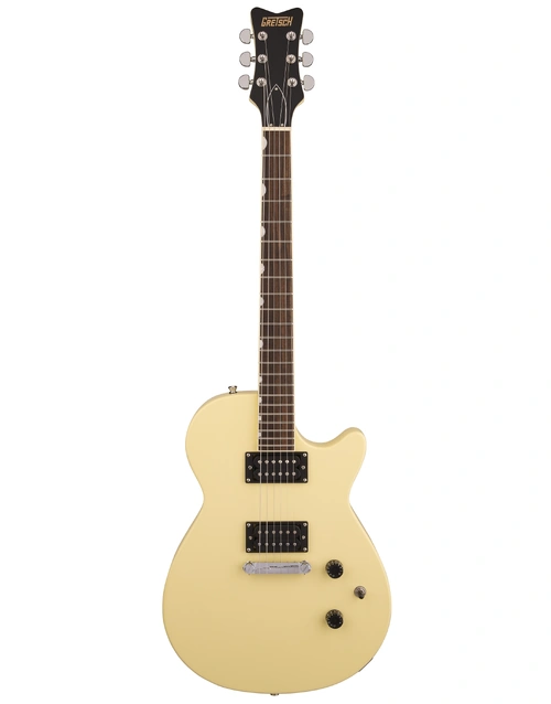 The Gretsch Streamliner Jet Club in Aged White delivers powerful tone, effortless playability, and striking vintage style. Its mahogany body with a belly contour and rounded heel offers excellent resonance and comfort, while the Fast “C” mahogany neck and 12" laurel fingerboard make for smooth, responsive playing. Dual HotWire high-output ceramic humbuckers provide rich lows, crisp highs, and punchy mids that shine across any genre. A compensated wraparound bridge, GraphTech NuBone nut, and Pitch-Perfect head angle ensure tuning stability and sustain, while the three-way switch and simple control layout give you instant tonal flexibility. Finished in elegant Aged White with signature Gretsch flair, this Jet is built to perform.