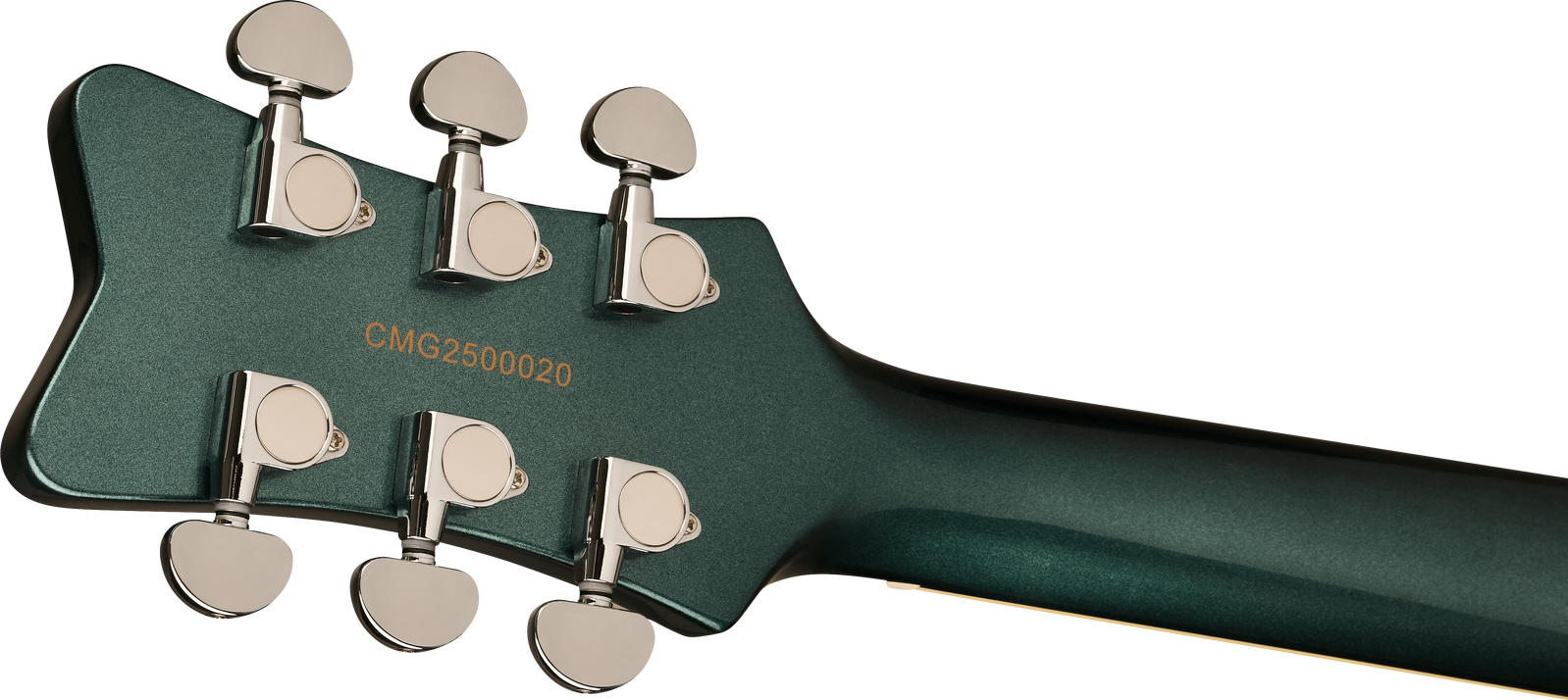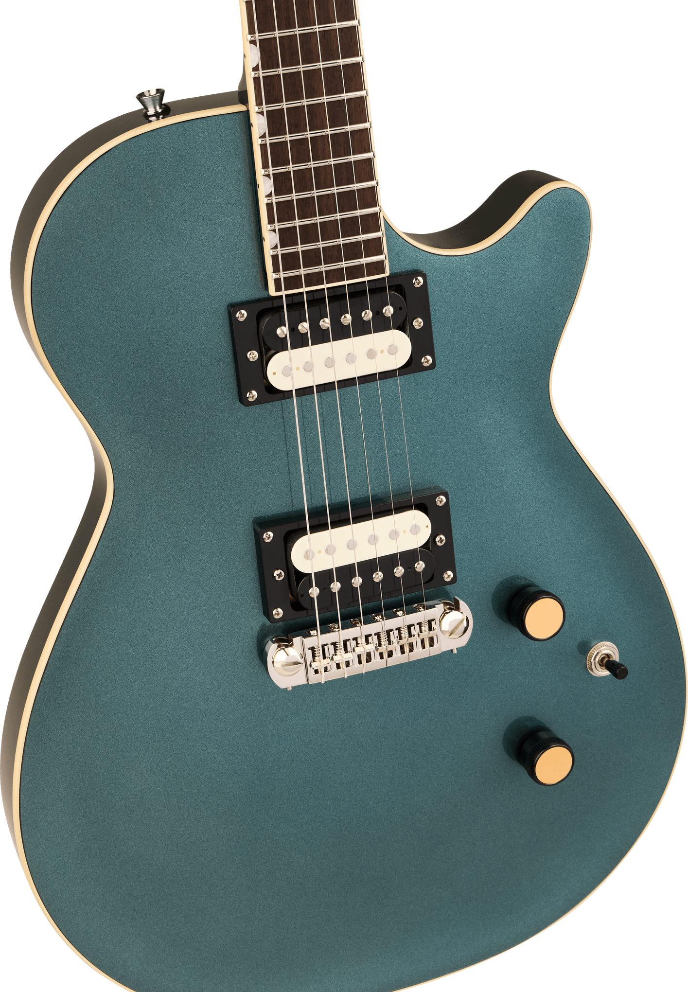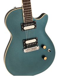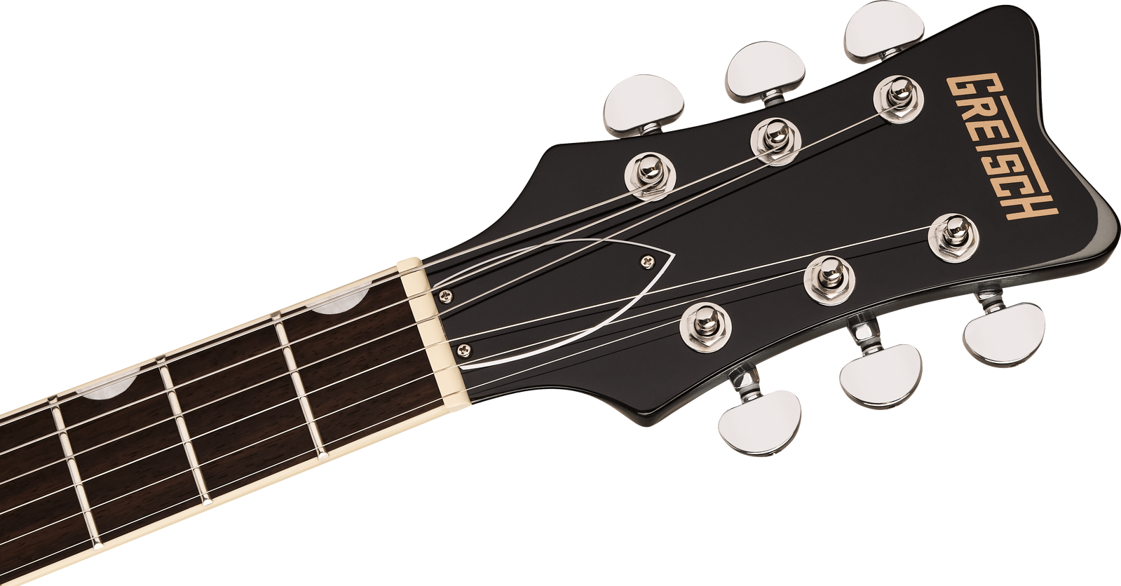 The Gretsch Streamliner Jet in Gunmetal delivers bold, dynamic tone and effortless playability in a sleek, modern package. Built with a mahogany body featuring a bound carved top, belly contour, and rounded heel, it offers rich resonance and exceptional comfort. The Fast “C” mahogany neck and 12" laurel fingerboard make it easy to glide through riffs and solos, while HotWire high-output ceramic humbuckers produce powerful, articulate tones suited for rock, blues, and beyond. A GraphTech NuBone nut, Pitch-Perfect head angle, and adjustable wraparound bridge ensure tuning stability and sustain. Finished in striking Gunmetal with classic Gretsch appointments, the Streamliner Jet looks as good as it sounds.