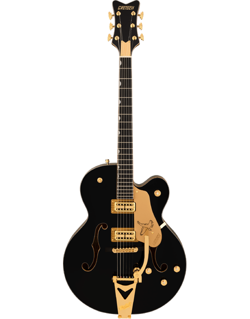 The Gretsch Synchromatic Falcon Hollowbody in Black delivers the prestige and power of the legendary Falcon in a refined, accessible format. Its 2.5" laminated maple body with Semi-Arc bracing resonates with classic Gretsch tone, while the soft “C”-shaped maple neck and ebony fingerboard ensure smooth, comfortable playability. Outfitted with Hi-Fidelity Filter’Tron pickups, it offers the shimmering clarity, warmth, and punch that define the Falcon sound. Multi-ply gold sparkle binding, thumbnail inlays, and gold hardware highlight its striking aesthetic, while the Adjusto-Matic bridge with ebony base, genuine bone nut, and Bigsby B60 vibrato tailpiece provide rock-solid tuning and expressive vibrato control. With its deluxe hardshell case included, this instrument is ready for stage or studio. At Riffs & Licks Music, we think this Gretsch combines timeless looks, luxurious detailing, and unmatched hollowbody tone in one iconic guitar.