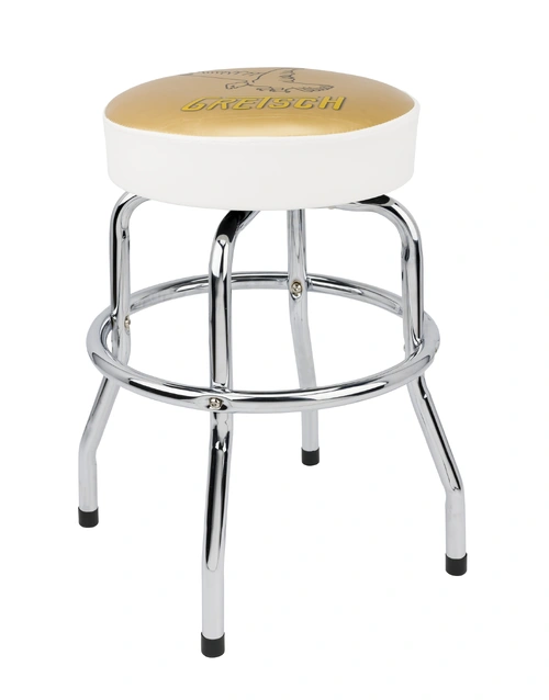 The Gretsch White Falcon Barstool 24" brings style and function to your music space with a design that exudes the legendary Gretsch spirit. The bold, gold seat top features the iconic Falcon pickguard logo, while the white vinyl sides offer a sleek, clean look that won’t scuff up under your black jeans. Built with a foam-padded seat for comfort, this barstool ensures you're sitting in style as you strum or sip your favorite drink. The tubular steel frame, measuring 1" in diameter, provides sturdy support, and the chrome-plated steel legs add a touch of sleek elegance. With a 360-degree swivel for ease of movement and recyclable, frustration-free packaging, this barstool is as functional as it is stylish. Some assembly is required, but once set up, it's the perfect addition to any Gretsch lover's space. At Riffs & Licks Music, we think this barstool is perfect for players who want to add a touch of Gretsch flair to their home setup.