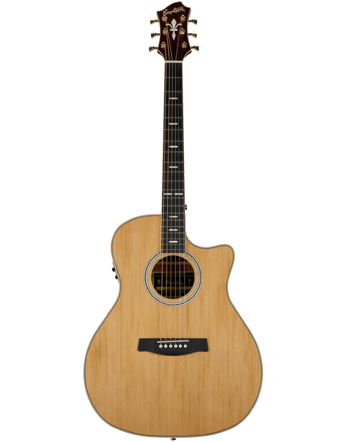 The Hagstrom Elfdalia II Grand Auditorium AC/EL Guitar, finished in Natural, features a solid Cedar top, and Mahogany back and sides, which creates a lively tone with a pronounced upper-mid range and plenty of overtones. Incredibly responsive to picking, this tonewood combination is a great choice for both finger-pickers and flat-pickers alike. A Resinator Wood fingerboard provides comfortable playability for hours on end - Resinator Wood is a wood composite that has a stable, clear and articulate tone similar to Ebony. Combined with its comfortable body size, the Hagstrom Elfdalia is a great option for singer-songwriters, with an on-board Fishman Isys+ 301 Preamp and Sonicore Pickup, which ensures the Elfdalia sounds as excellent when amplified, as it does acoustically.