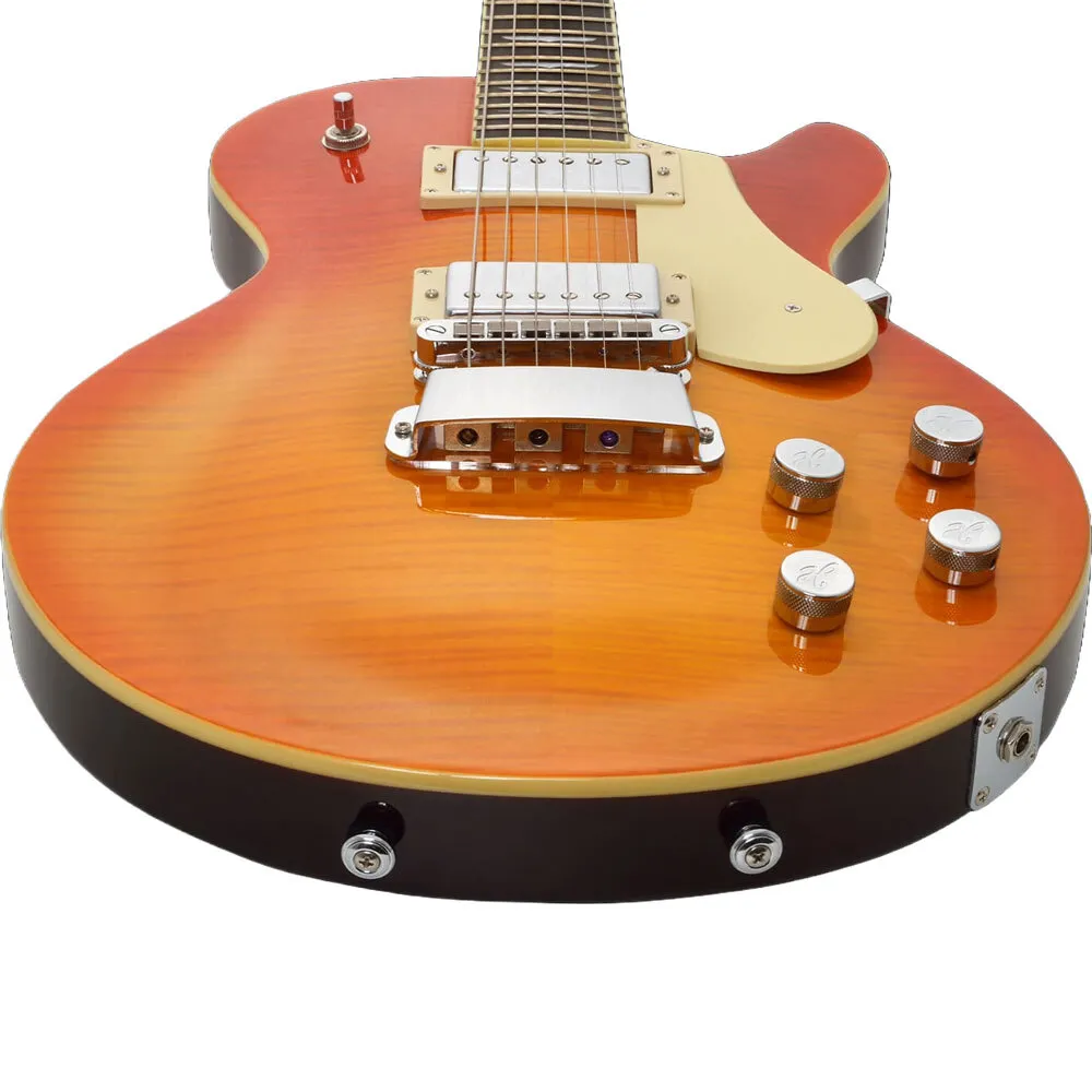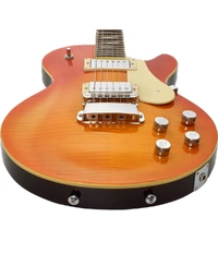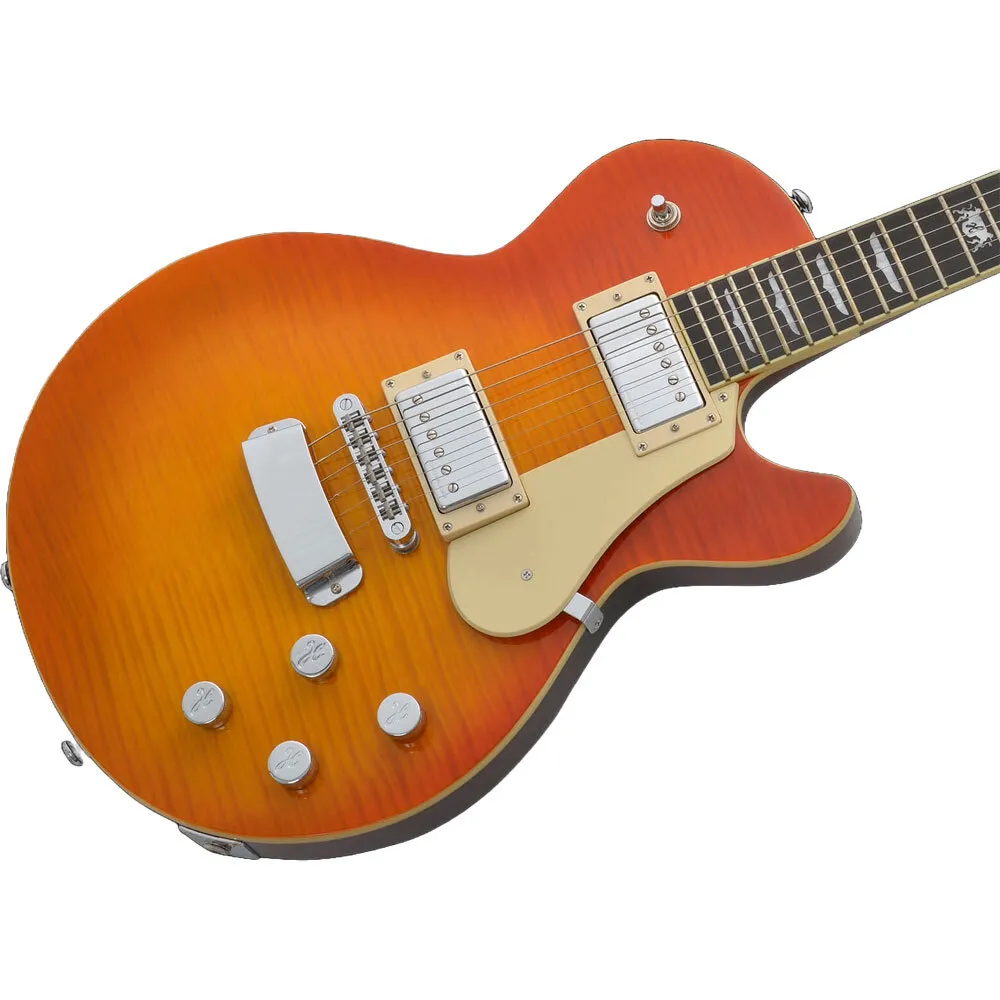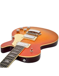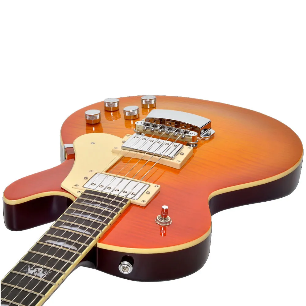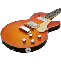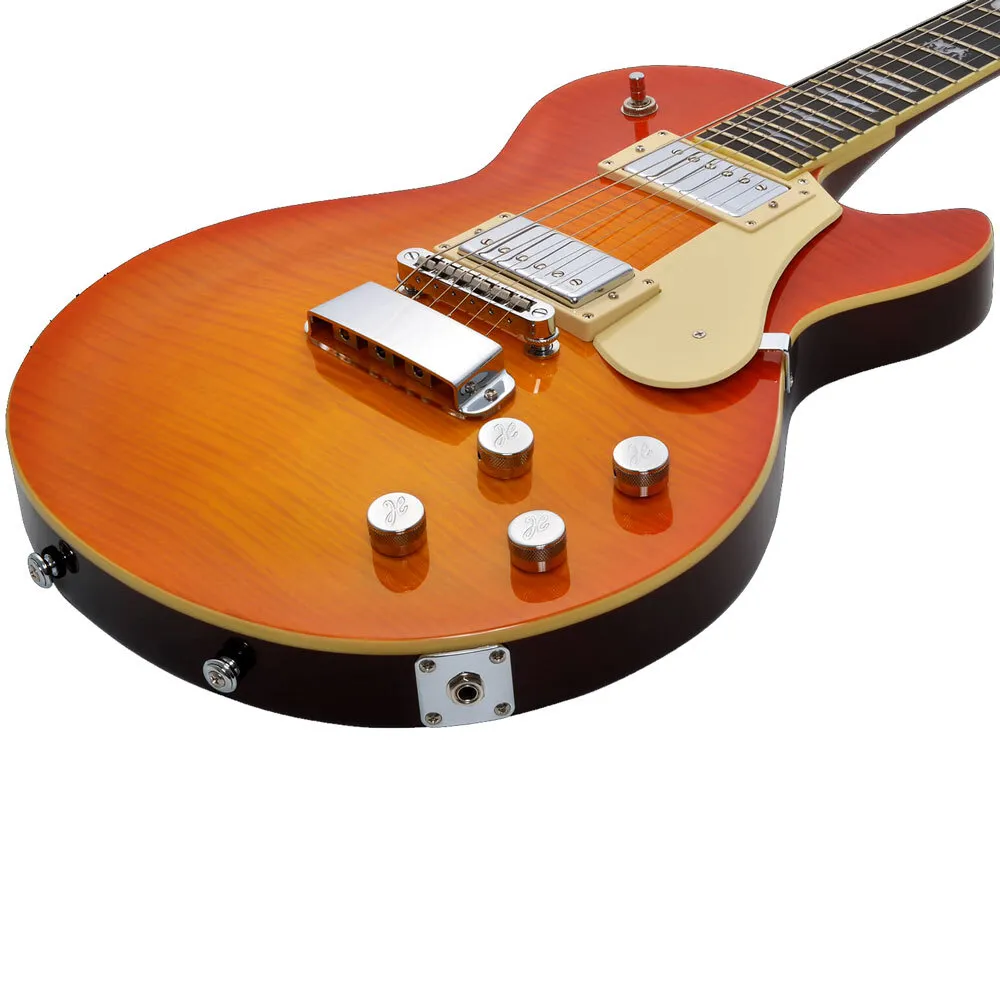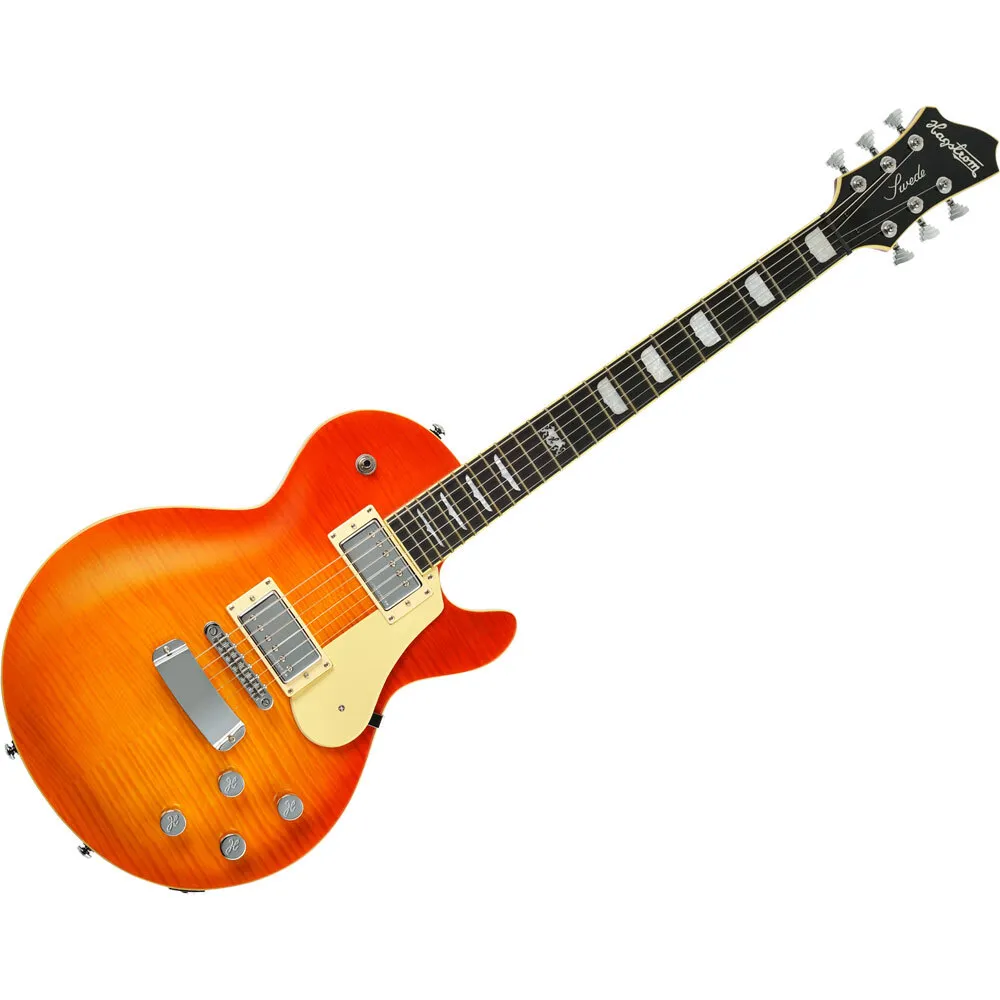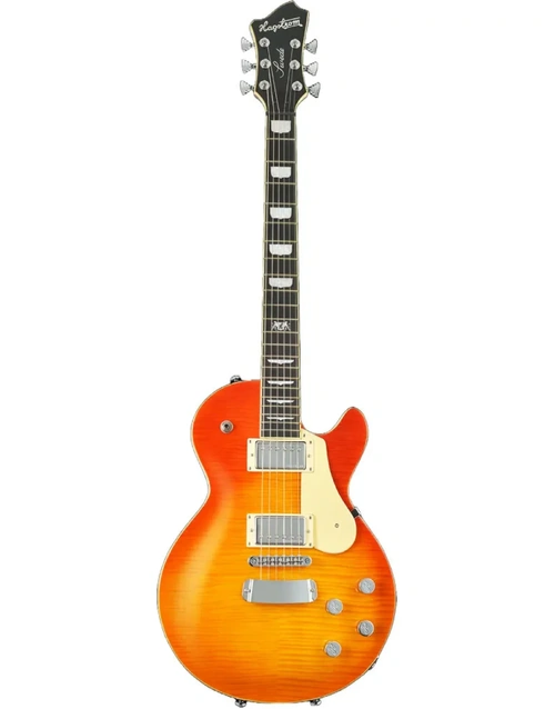 The Hagstrom Swede in Mandarin Burst offers bold vintage character and modern performance in a compact, single-cut design. With a short 24.75" scale length, it delivers a warm, thick tone with exceptional clarity, sustain, and harmonic richness. Its mahogany body and flame maple top are matched with a mahogany set neck and Hagstrom's Nape-Tenon joint for improved resonance and fret access.