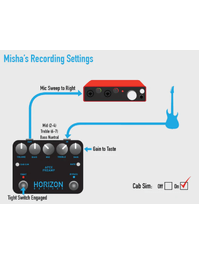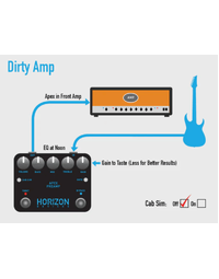 Plug the Apex straight into a clean amp to EQ your tone, and dial in the gain, for tight, crushing riffs. Plug it into a dirty amp as a gain stack, or slam on the tight switch for even tighter, more crushing riffs. Plug it straight into an interface, switch on the cab sim, dial in the virtual mic placement to your liking, and get (you guessed it) tight, crushing riffs straight into your DAW. You can even use the Apex, with Cab Sim engaged, to go straight to front-of-house at your next gig. The Apex is great on its own, and it plays nicely with other pedals; just put boosts (like the Horizon Devices Precision Drive) before, and Effects (like the Horizon Devices Flux Echo) after the Apex in your chain.