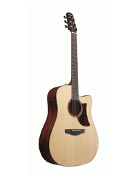 The Ibanez AAD170CE LGS Acoustic Electric Guitar, finished in Natural Low Gloss, features Ibanez' Grand Dreadnought body shape. The Grand Dreadnought has a brighter tone, with greater projection, enhanced dynamic range, and thanks to the ergonomics of the Grand Dreadnought's design, the AAD100 boasts extremely comfortable playability. Playability is even further enhanced by a Low Oval Grip Thermo-Aged Nyatoh neck, and Ovangkol fretboard with Rounded Edges. The Low Oval profile is performance-designed to make chord strumming easier, while Thermo Aging hardens the neck, making it easier and more consistent to play.
