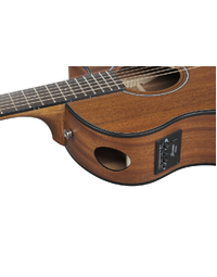 The Low Oval Grip Okoume neck provides easy chord strumming, enhancing the overall playability of the guitar. The Purpleheart fretboard adds a touch of elegance while accentuating the instrument's rich tonal character. Featuring a solid Sapele top and Sapele back and sides, this guitar produces a warm, full tone with a full-bodied and warm mid-range, complemented by a bright tone in the highs.
