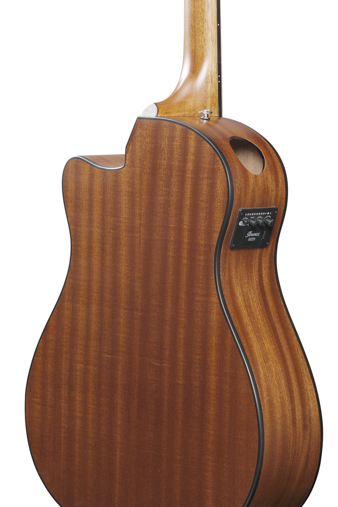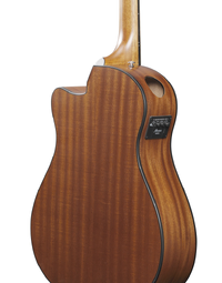 The Ibanez T-bar Undersaddle pickup accurately translates the full sound to amplification systems, ensuring faithful reproduction. The Ibanez AEQ-TP2 preamp, equipped with an onboard tuner and 2-band EQ, located on the upper bout, provides extra punch and tonal control for a versatile playing experience.