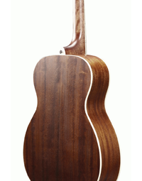 The 3pc Nyatoh/Maple Neck provides a rich mid-low end. The Ovangkol fretboard provides greater playing comfort. Solid Okoume top offers a full-bodied and warm mid-range and a bright tone. The Okoume back and sides generate a woody, warm tone when the guitar is played softly or finger-picked and provide punchy high-mids with a clear projection when strummed. Thermo Aged, a special drying process, makes the Ovangkol bridge light and hard and provides stability and better resonance with enhanced lows and low-mids.
