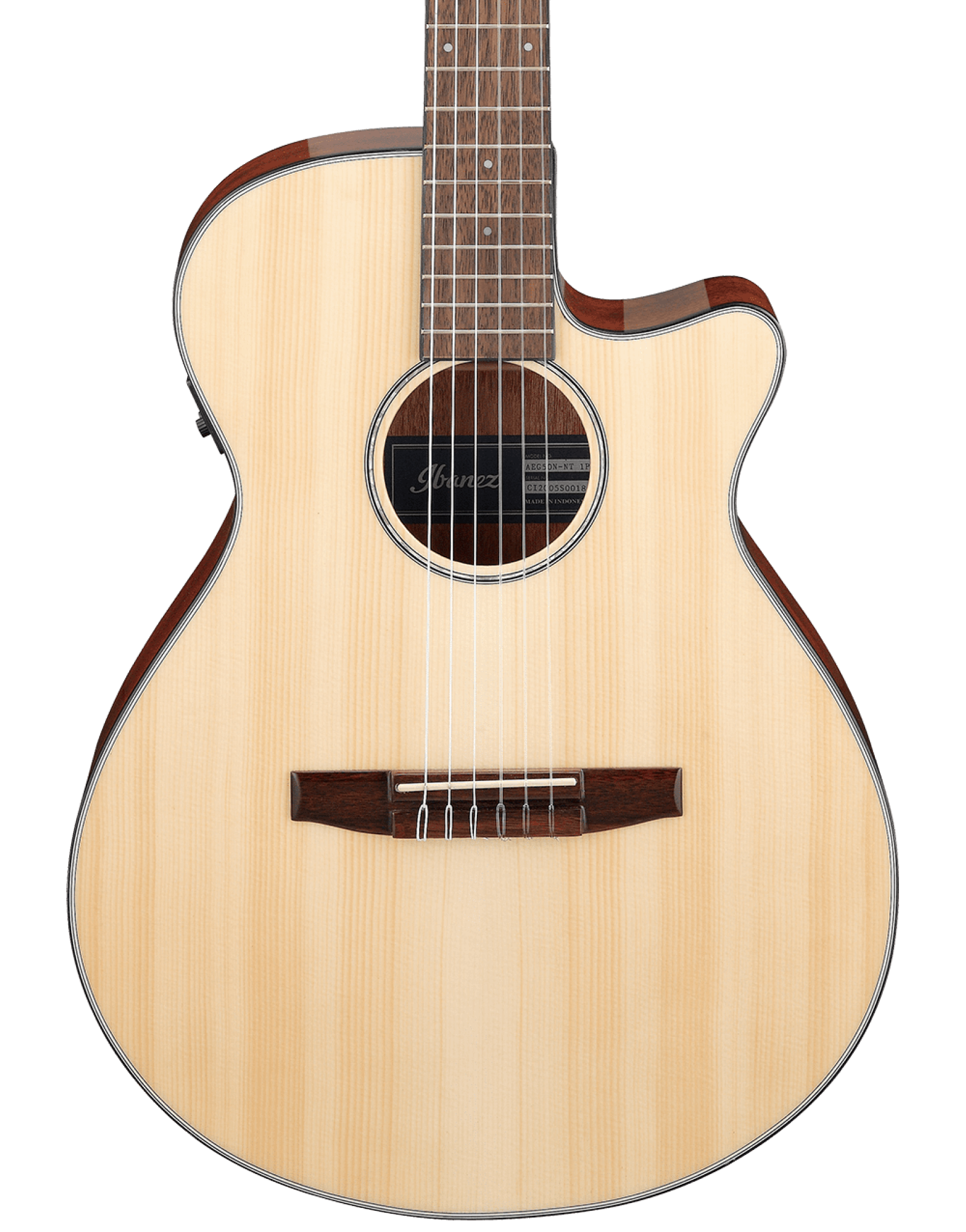 The Ibanez AEG50N is designed for players who want the expressive feel of a classical nylon string guitar in a comfortable, modern body shape. The slim AEG body sits close to the player, making it easy to manage during long practice sessions or live performances. A spruce top delivers clear articulation and balance, while okoume back and sides add a warm, woody response that works well for fingerstyle, Latin, and softer pop arrangements.