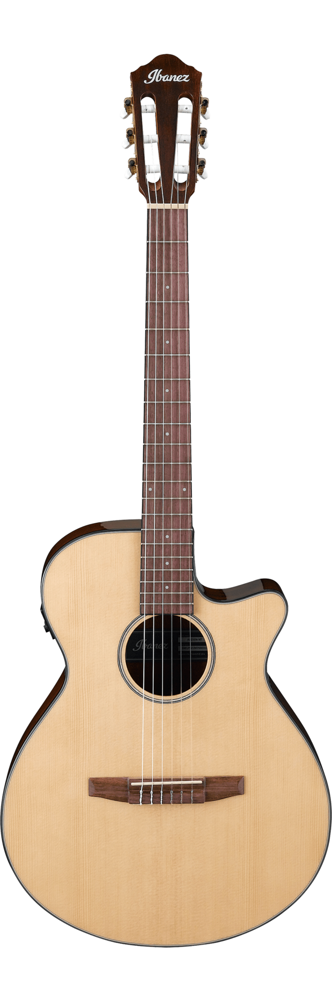 The AEG, a compact body electric acoustic guitar with a slim neck has been well-accepted for its easy playability for more than two decades. Ibanez is proud to announce that the AEG series has been renewed with updated electronics and looks. The changes were based on the concept, “simple and easy control.” The AEG50N starts with a new preamp, an Ibanez AEQ-TTS. The small and simple preamp has only two control knobs, volume and shape. This at-a-glance tone control offers natural acoustic sound in the center position. It allows players to adjust the tone easily and enables them to go from low, fat and powerful tones to a bright and crispy sound while adjusting only one knob. A new easy-to-read onboard tuner with LCD(liquid crystal display) is located on the preamp. This AEG50 with Nylon strings comes with a simplified rosette, a binding and ornamentation on the headstock. These finer details add a sharp and stylish atomosphere to the guitar. Other features include a Spruce top and a Sapele back & sides body and an Ibanez T-bar II Undersaddle pickup which equalizes the volume from each string and delivers a well-balanced signal.