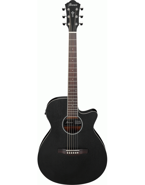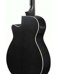 The guitar's sleek design is complemented by a weathered black open pore finish, giving it a unique look and feel. The comfortable Okoume neck and Purpleheart fretboard provide a smooth and effortless playing experience, while the open-pore finish allows the natural sound of the guitar to shine through. A sapele top, back & sides provides the AEG7MH with a rich and full sound with a nice tonal balance, similar to Mahogany, but with a brighter top end. The AEG7MH also features Ibanez Advantage bridge pins that provide superior tuning stability, making string changes a breeze while enhancing the overall resonance and sustain of the guitar.