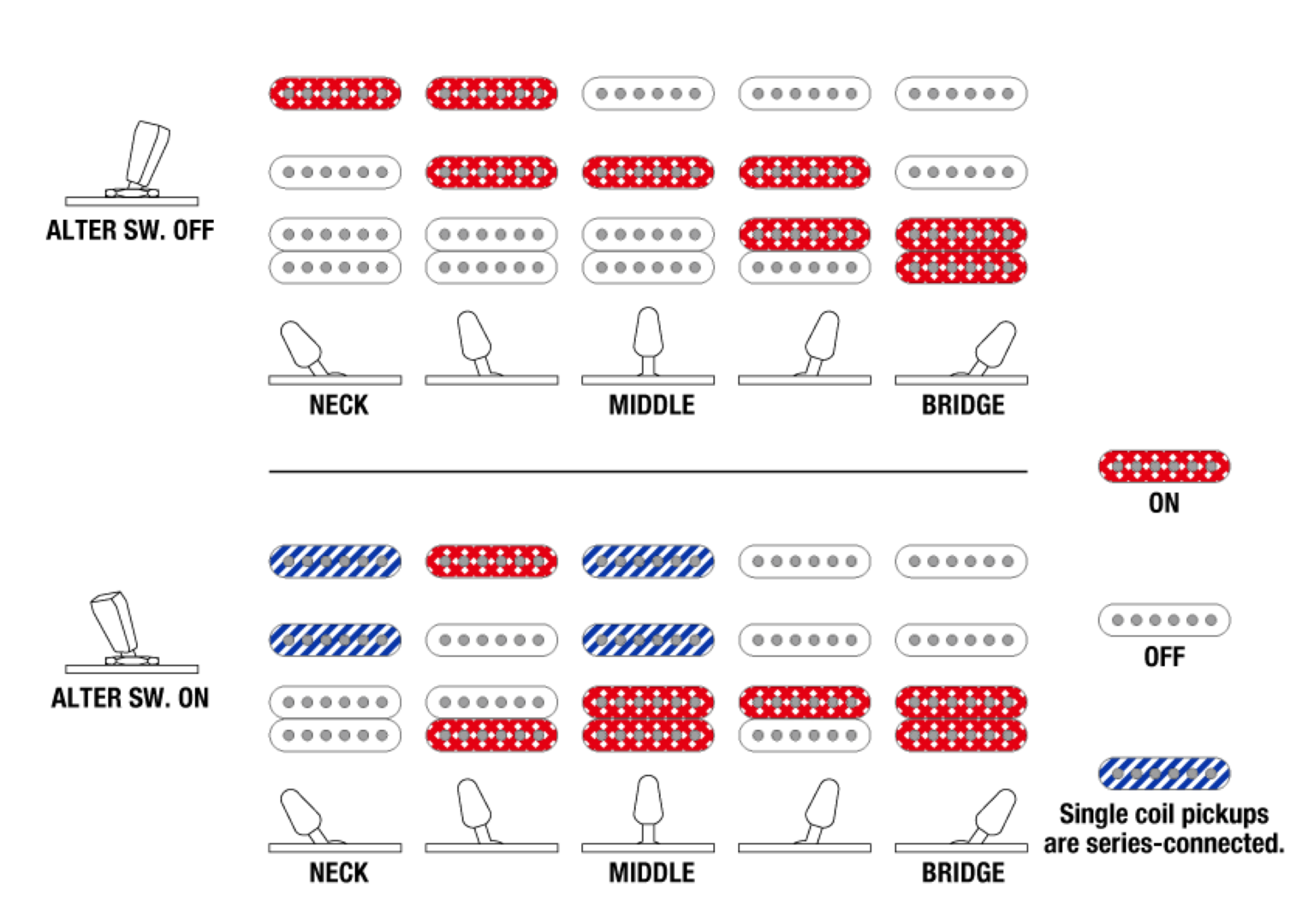 | Electronics | dyna-MIX9 Switching System with Alter Switch, Master Volume, Master Tone, 5-Way Selector Switch |