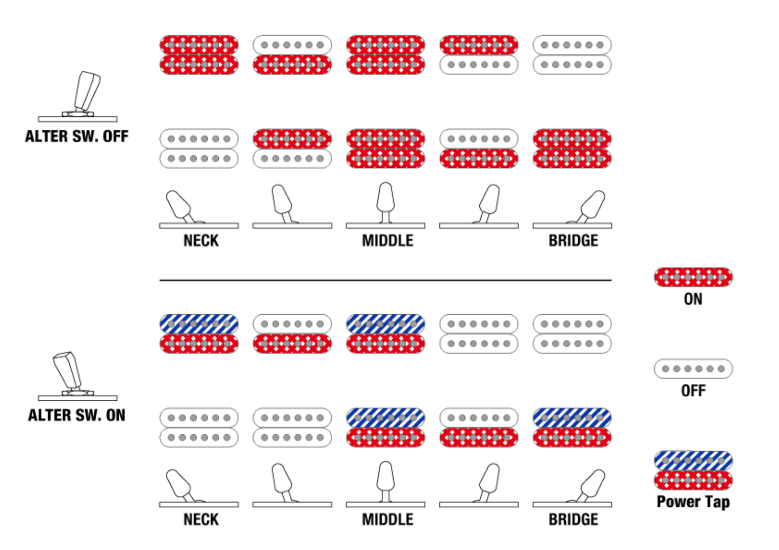 As a Prestige model, the AZ24027 combines high-tech manufacturing techniques with old-world Japanese craftsmanship, in order to achieve true innovation in design and construction, for the ultimate in Precision, Performance, and Playability. The AZ24027 features Seymour Duncan Hyperion pickups. The moderate output that runs through their Alnico-5 magnets keep the clarity of these pickups' fundamental tone when using distortion, and deliver a clear pick attack. From treble to bass, the overall tonal balance is evenly adjusted and works well with various effect pedals. The versatility of these pickups are greatly expanded, thanks to a dyna-MIX10 switching system with Alter Switch. The dyna-MIX 10 offers ten sound variations and can easily switch from humbucker and single coil modes with the mini switch. The power Tap mode provides a realistic single coil sound despite its two humbucker pickup layout.