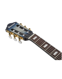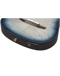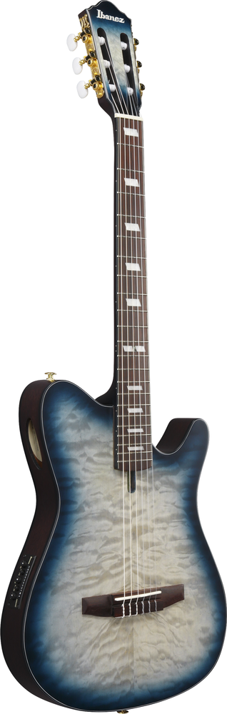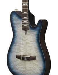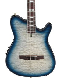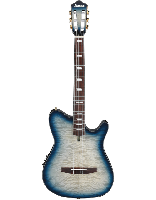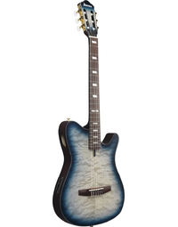 The Ibanez FRH20QMN CTL Nylon String Acoustic Guitar blends modern playability with refined design. Featuring a Quilted Maple top over Sapele back and sides, this thinline body delivers a warm, articulate nylon tone with reduced feedback thanks to its soundhole-free construction. The Nyatoh set-in neck and Rosewood fretboard ensure smooth playability, while a 46mm bone nut and 400mm radius offer a comfortable balance between classical and steel-string feel. A side sound port lets you hear your natural acoustic tone clearly, making it an ideal instrument for both stage and studio. Equipped with an Ibanez Undersaddle pickup and AEQ210T preamp with onboard tuner, it provides reliable amplified performance and tonal control. Finished in Cosmic Blue Starburst Low Gloss, this guitar pairs striking looks with versatile function. At Riffs & Licks Music, we think it’s a sleek, modern nylon-string that feels at home in any performance setting.