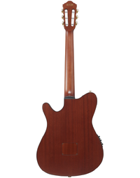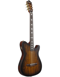 The Ibanez FRH20SMN TCL Nylon String Acoustic Guitar delivers a fresh take on classical-inspired design with modern playability. Its Spalted Maple top provides striking visual character while contributing to a bright, articulate tonal response. Sapele back and sides add warmth and depth, while the Nyatoh neck and Rosewood fretboard ensure smooth playability with a well-balanced tone. A slim 46mm nut width and 400mm radius make this model more approachable for players used to steel-string or electric guitars. Fan bracing enhances resonance, while the modified FR hollow body helps reduce feedback for stage use. Equipped with an Ibanez Undersaddle pickup and AEQ210T preamp with onboard tuner, it’s ready for both studio and live performance. The side sound port brings the acoustic tone directly to the player, and the Tobacco Burst Low Gloss finish completes its refined look. At Riffs & Licks Music, we think this guitar is ideal for players seeking a nylon-string that blends classical warmth with modern versatility.