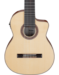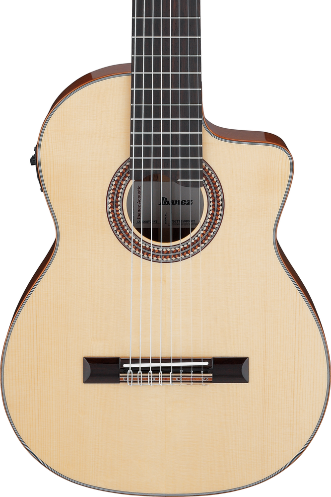 The Ibanez GA3008CE is an 8-string classical guitar built for players exploring extended range without sacrificing traditional nylon-string feel. A solid German spruce top paired with African mahogany back and sides delivers clear articulation, warm mids, and strong projection, making it well suited to complex arrangements and layered playing.