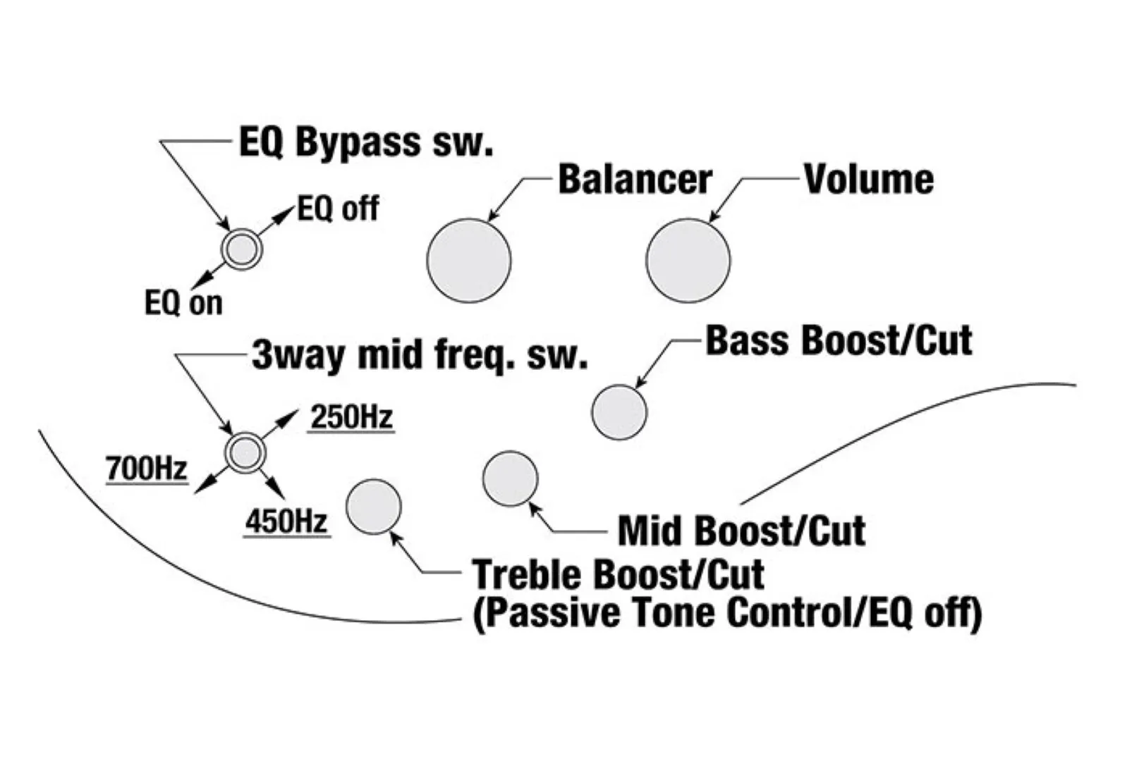 | Controls | 1 Volume, 1 Balancer, Ibanez Custom Electronics 3-band EQ w/EQ bypass switch (passive tone control on treble pot), 3-way Mid frequency switch |