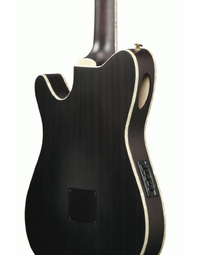 The Ibanez TOD10N TKF Tim Henson Signature Classical Nylon, finished in Transparent Black Flat, features a solid Sitka Spruce top for an enormous frequency range that offers wave after wave of shimmering highs along with tight mids and a full-bodied low end. Sapele back and sides offer a full-bodied and warm mid-range and a bright tone. A Fishman Sonicore pickup accurately translates a full guitar sound to whatever amplification system you plug into, while the Ibanez AEQ210TF preamp provides the extra punch of on-board EQ, and the convenience of an easy-to-read digital tuner. A thin, compact Modified FR hollow body with fan bracing with superior high fret access contribute to the superb playability of this guitar. It has less feedback as there’s no sound hole on the body top. Fan bracing, which is commonly used for classical guitars, gives this guitar a warm and natural nylon string sound. The sound port on the body side allows you to feel and hear the pure acoustic tone of this guitar more clearly and directly. The combination of a narrow 46mm width nut and 400R fretboard radius makes for easy fingering.