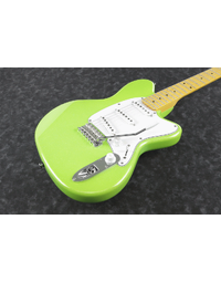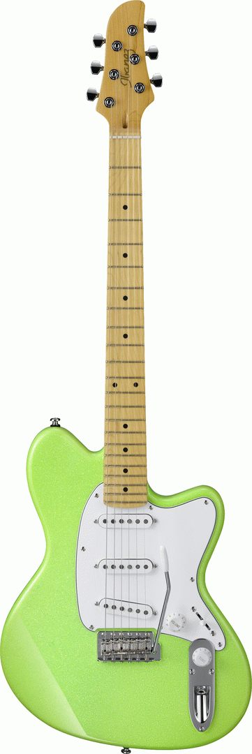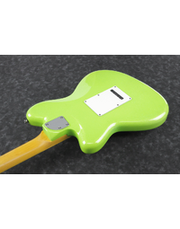 The Ibanez YY10 SGS Yvette Young Signature Electric Guitar, finished in Slime Green Sparkle, features an extremely comfortable and stable Maple neck and fingerboard. An Alder body delivers a well-balanced, pleasantly bright tone, with excellent resonance and sustain, as well as creating the perfect tonal foundation for a trio of Seymour Duncan Five Two Strat Style Pickups. Using a combination of Alnico II and Alnico V rod magnets, these pickups maintain the sweet crystalline tone of a strat, retaining all of the articulate snap on the low strings, but softening the treble attack on the high strings. The bridge pickup is wound slightly hotter than the middle and neck, perfect for full-bodied sustain and stronger attack. These pickups have no shortage of dynamics and expressiveness, which is perfect for creating fingertone for fingerstyle players, and since the middle pickup is reverse wind/reverse polarity, positions two and four are hum-cancelling, making this set an incredibly versatile trio of single-coils.